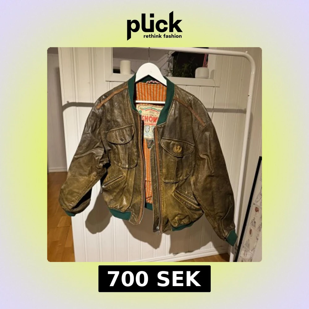 Säljer en cool brun skinnjacka från Showa med gröna detaljer. Jackan har en vintage look med dragkedja och stora fickor framtill. Insidan har ett randigt mönster i orange och vitt. Perfekt för dig som vill ha en unik stil!