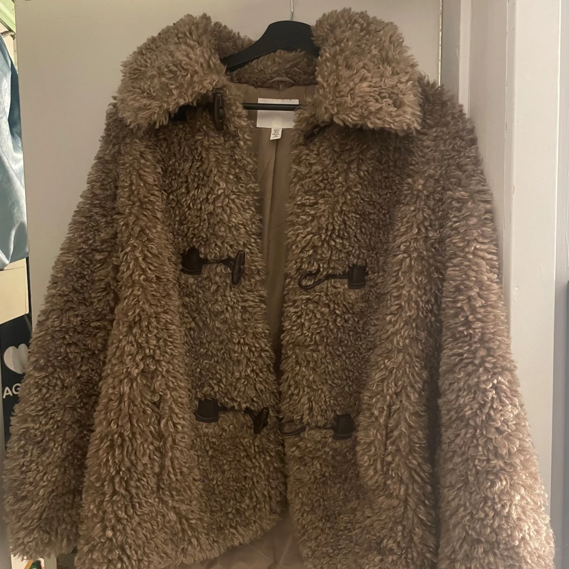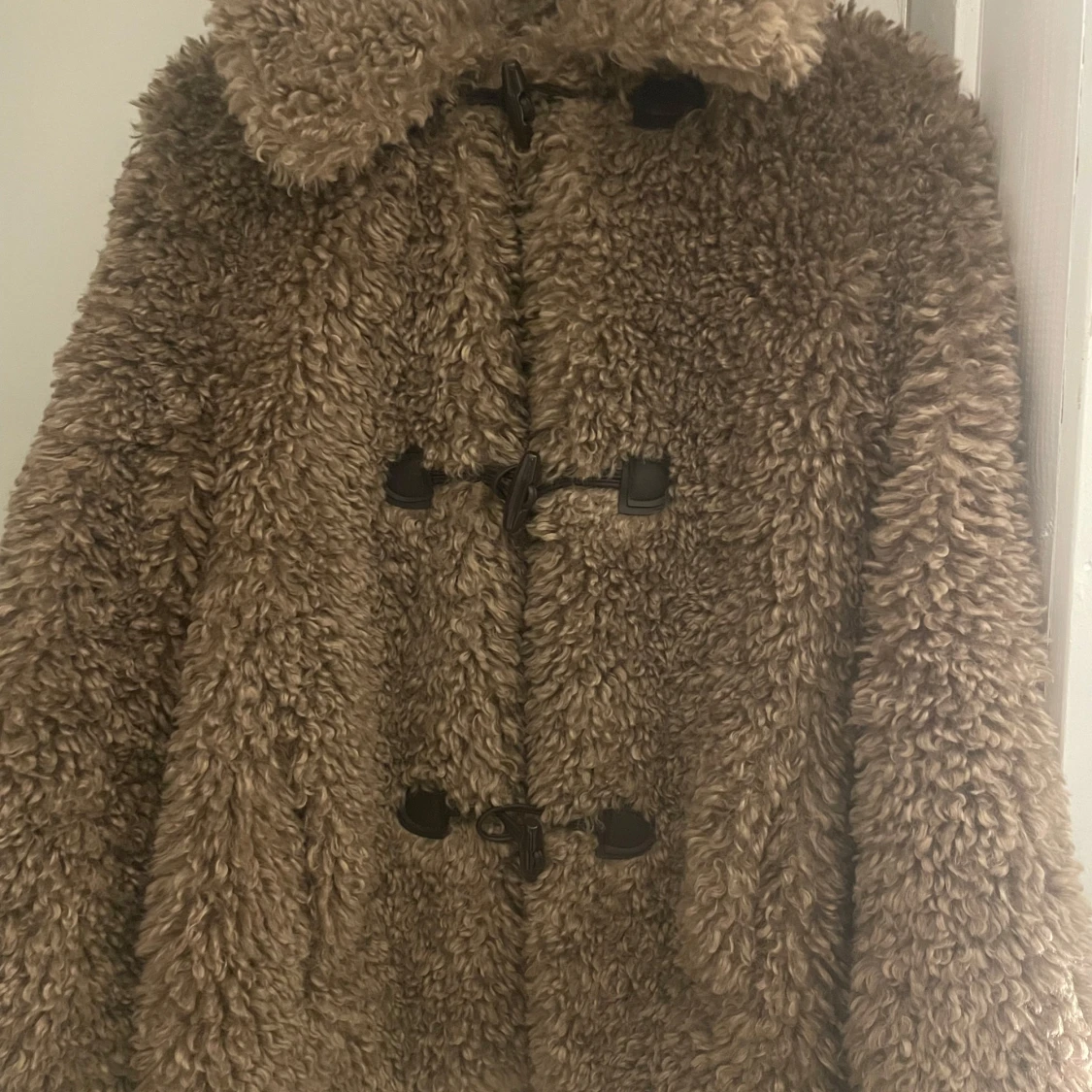 Mysig brun teddyjacka med stora knappar framtill. Perfekt för kyliga dagar med sin fluffiga och varma design. Jackan har en klassisk krage och är långärmad.