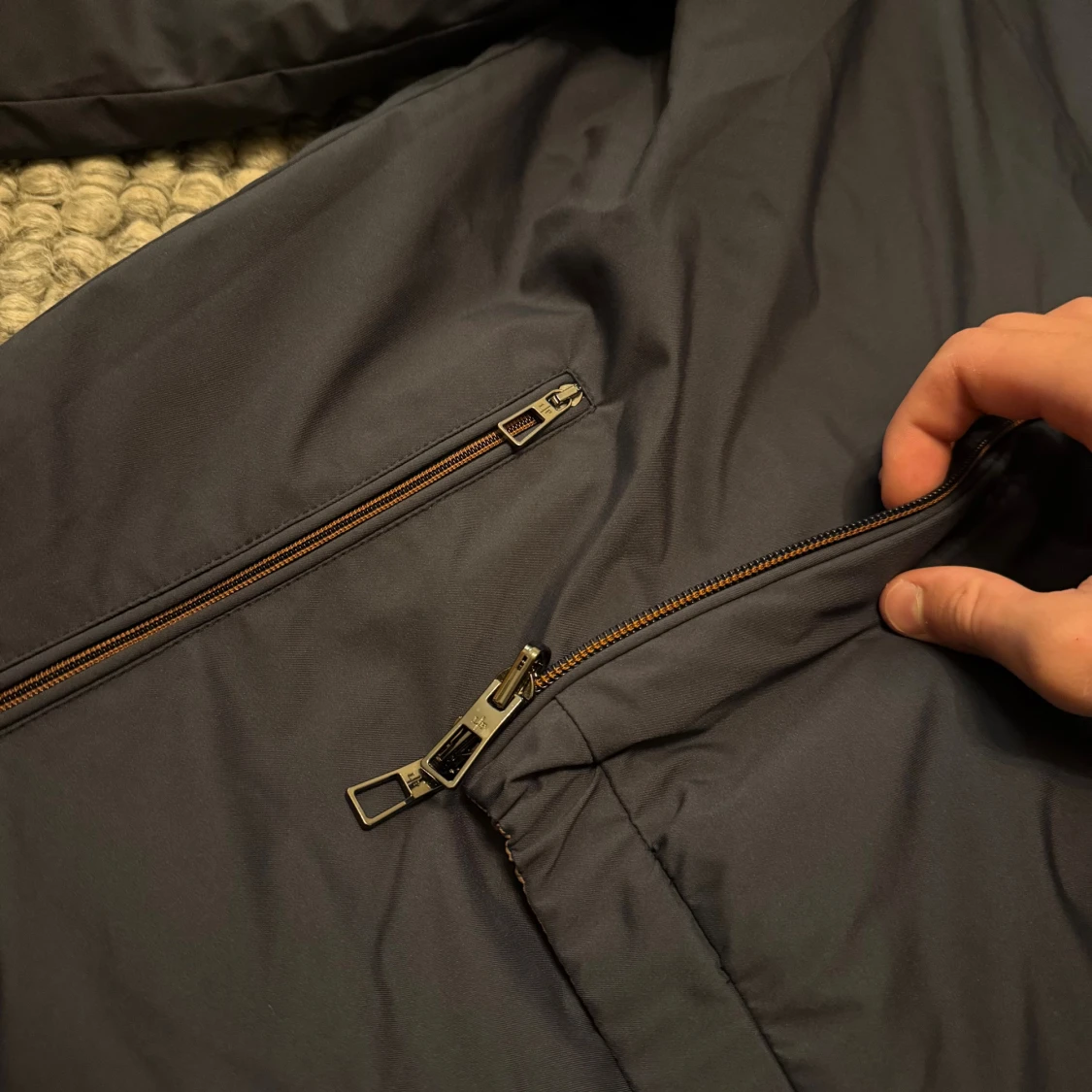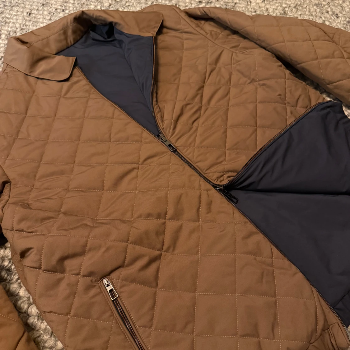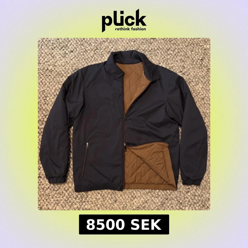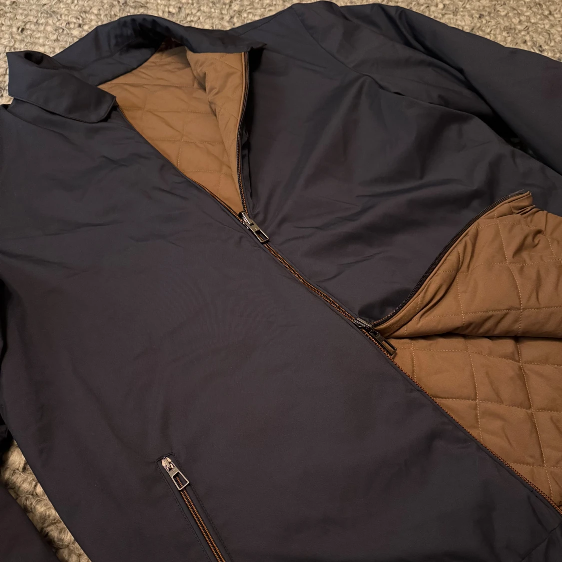 Snygg vändbar jacka med ena sidan i mörkblått och andra i brun, båda med quiltad design. Jackan har dragkedja, två fickor med dragkedja och elastiska muddar. Perfekt för dig som vill variera din stil mellan klassiskt marinblått och trendigt brunt.
