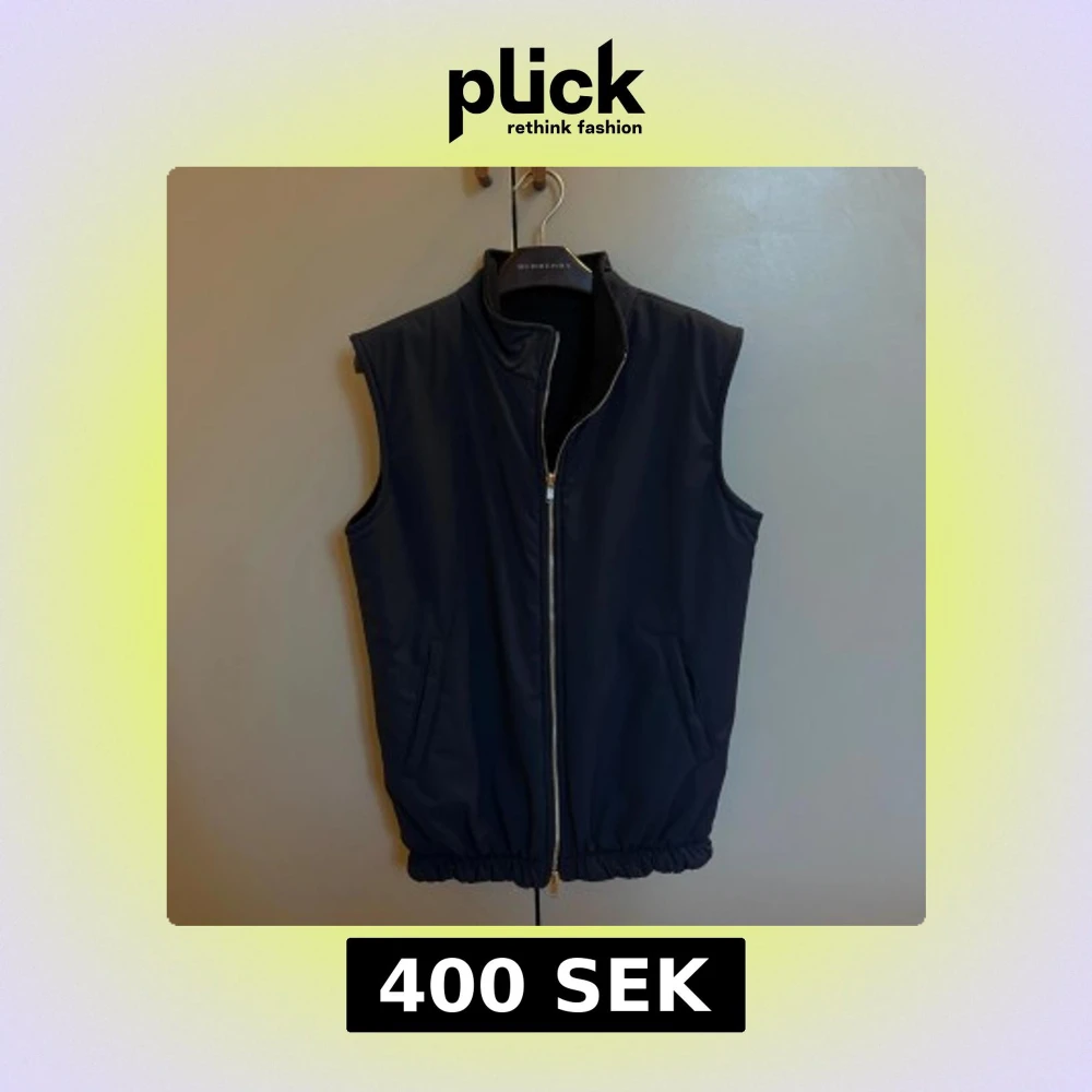 Stilren mörkblå vändbar väst från L'Amoure med hög krage och dragkedja framtill. Ena sidan är slät och blank, andra sidan är matt och mjuk. Två fickor på varje sida och elastisk nederkant för en snygg passform. Storlek S i nyskick.