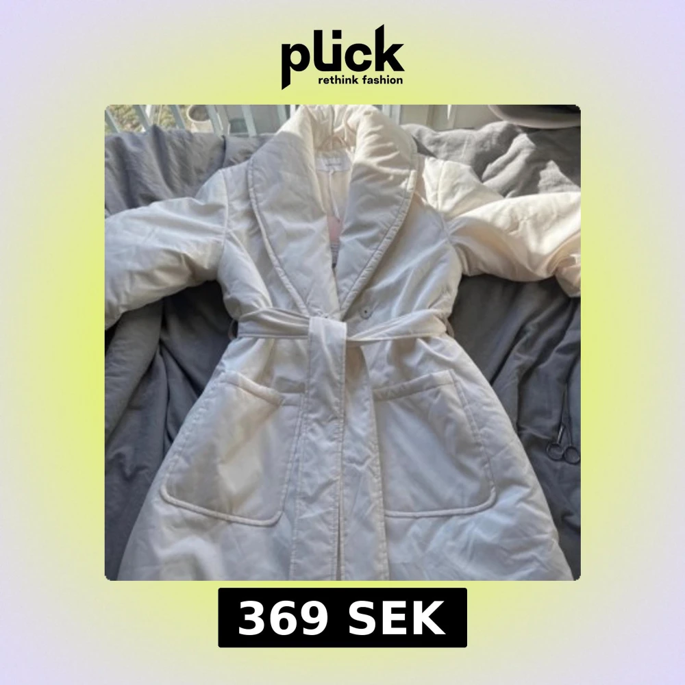 Säljer en vit pufferjacka med quiltad design och bred krage. Jackan har stora fickor framtill och ett matchande bälte i midjan för snygg passform. Perfekt för kyliga dagar och har en modern, clean look som är lätt att styla med olika outfits.