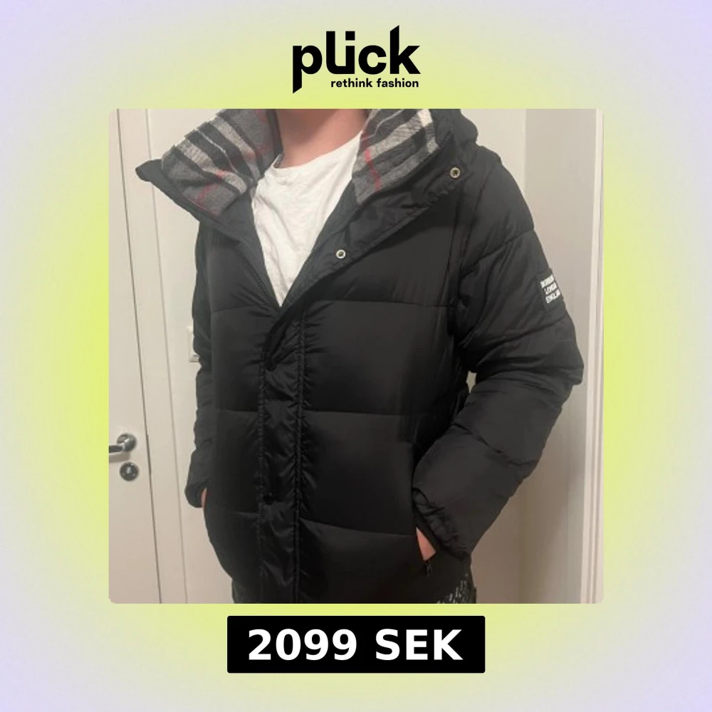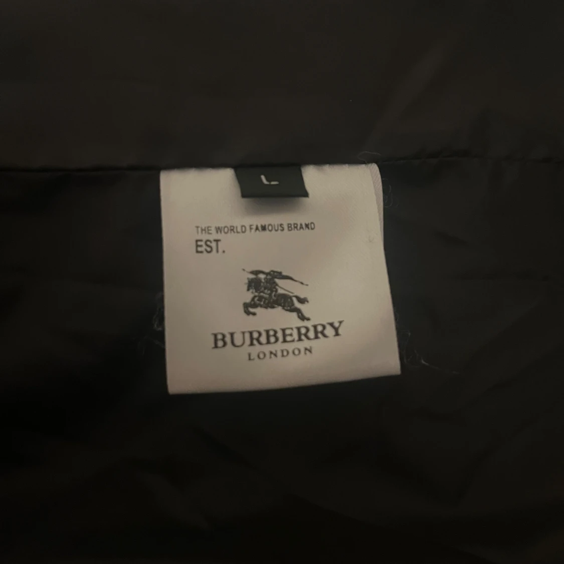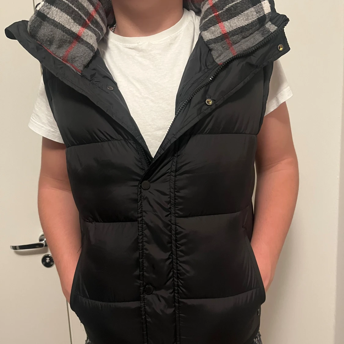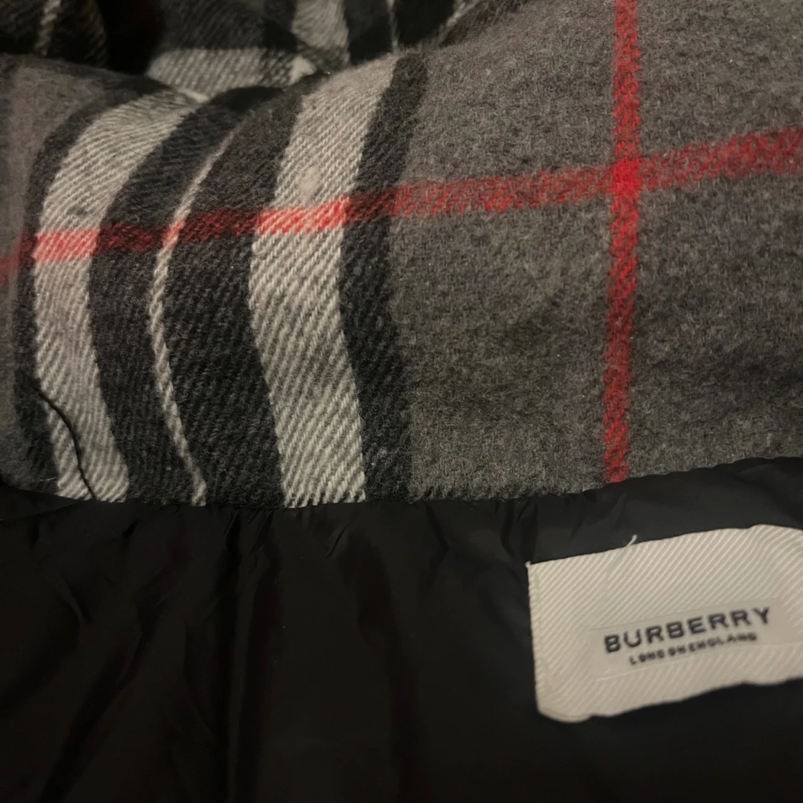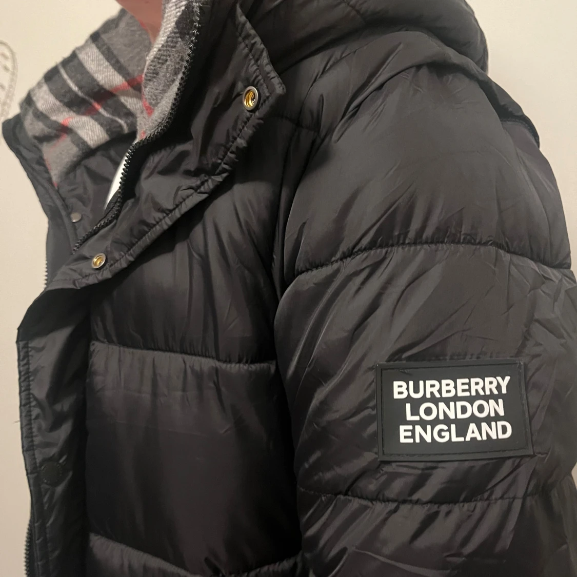 Säljer en svart dunjacka från Burberry London England med avtagbara ärmar så den kan användas som väst. Jackan har rutigt grått innerfoder med röda och svarta detaljer, dragkedja och knappar framtill samt huva. Klassisk Burberry-logga på ärmen. Rikgtigt skön och varm och perfekt inför de kalla tiderna