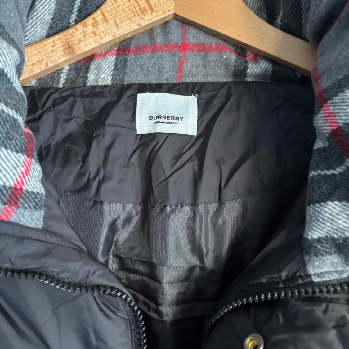 Fett burberry jacka med röda strip, passar perfekt till vinter. Har borttagbarra armar. I mycket bra skick. Storlek M-l. Sckickar samma dag.