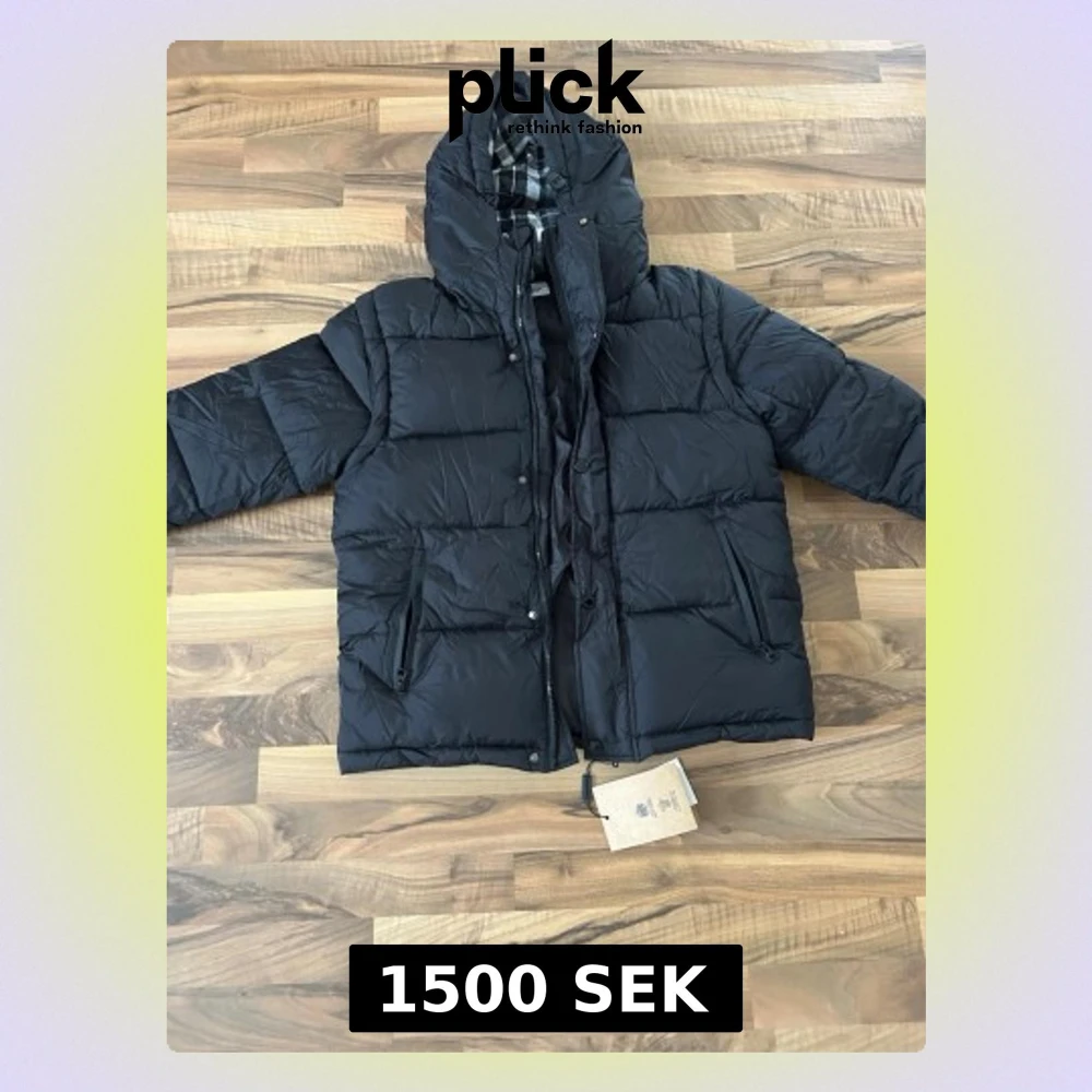 Snygg svart dunjacka med stor huva och rutigt foder i grått, vitt och rött. Jackan har dragkedja och knappar framtill samt två snedställda fickor med dragkedja. Perfekt för kalla dagar och riktigt skön att bära. Helt ny som jag fick av en kompis är XL men känns mer som L