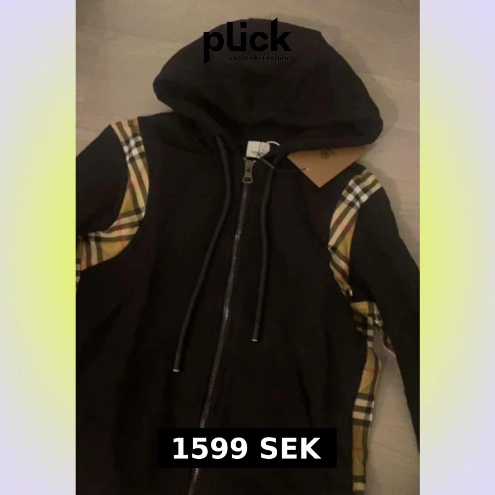 Svart hoodiejacka från Burberry med klassiska rutiga paneler i beige, rött och svart längs ärmarna. Jackan har huva med snörning och hel dragkedja framtill. Perfekt för dig som vill ha en streetig och lyxig look. 10/10