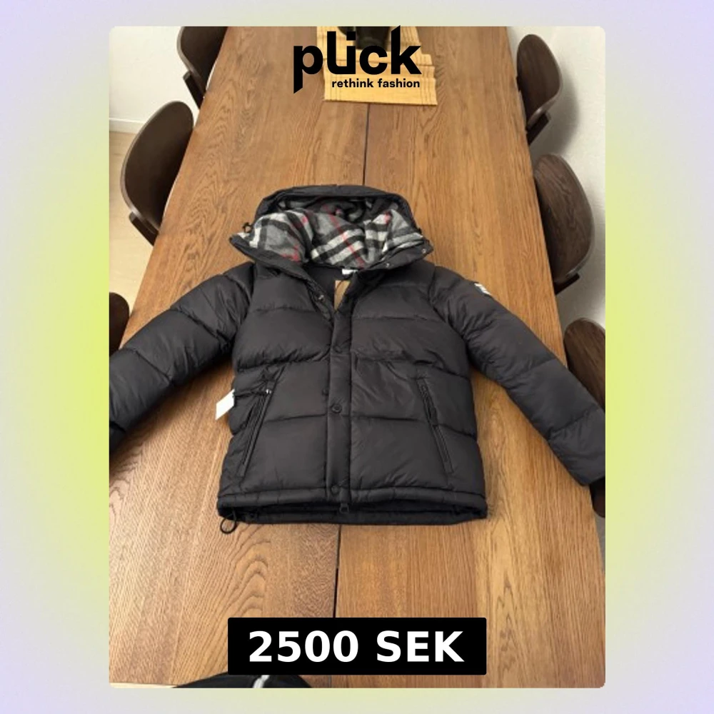 Svart pufferjacka från Burberry med klassisk logopatch på ärmen och rutigt foder i huvan. Jackan har dragkedja, knappar och två sidofickor med snygga detaljer. Perfekt för kalla dagar och har en riktigt schysst streetstil. Finns äkthetsbevis