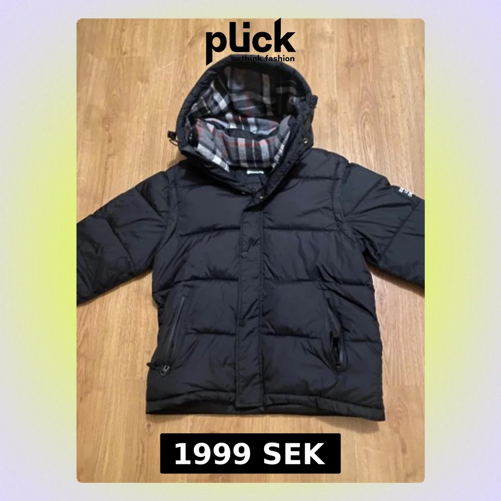 Svart pufferjacka från Burberry London England med huva och rutig insida i grått, vitt och rött. Jackan har dragkedja och knappar framtill samt två fickor med dragkedja. Klassisk Burberry-patch på ärmen och quiltad design för extra värme.