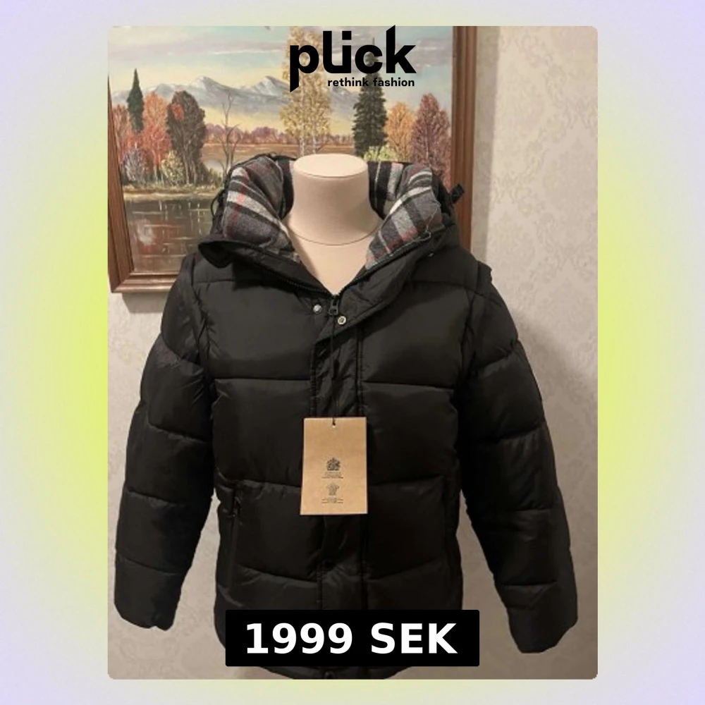Svart pufferjacka från Burberry med stor huva och rutigt foder. Jackan har en tydlig Burberry London England-patch på ärmen, dragkedja framtill och justerbar huva med spänne. Perfekt för kalla dagar och har en schysst, modern look. Pris kan diskuteras