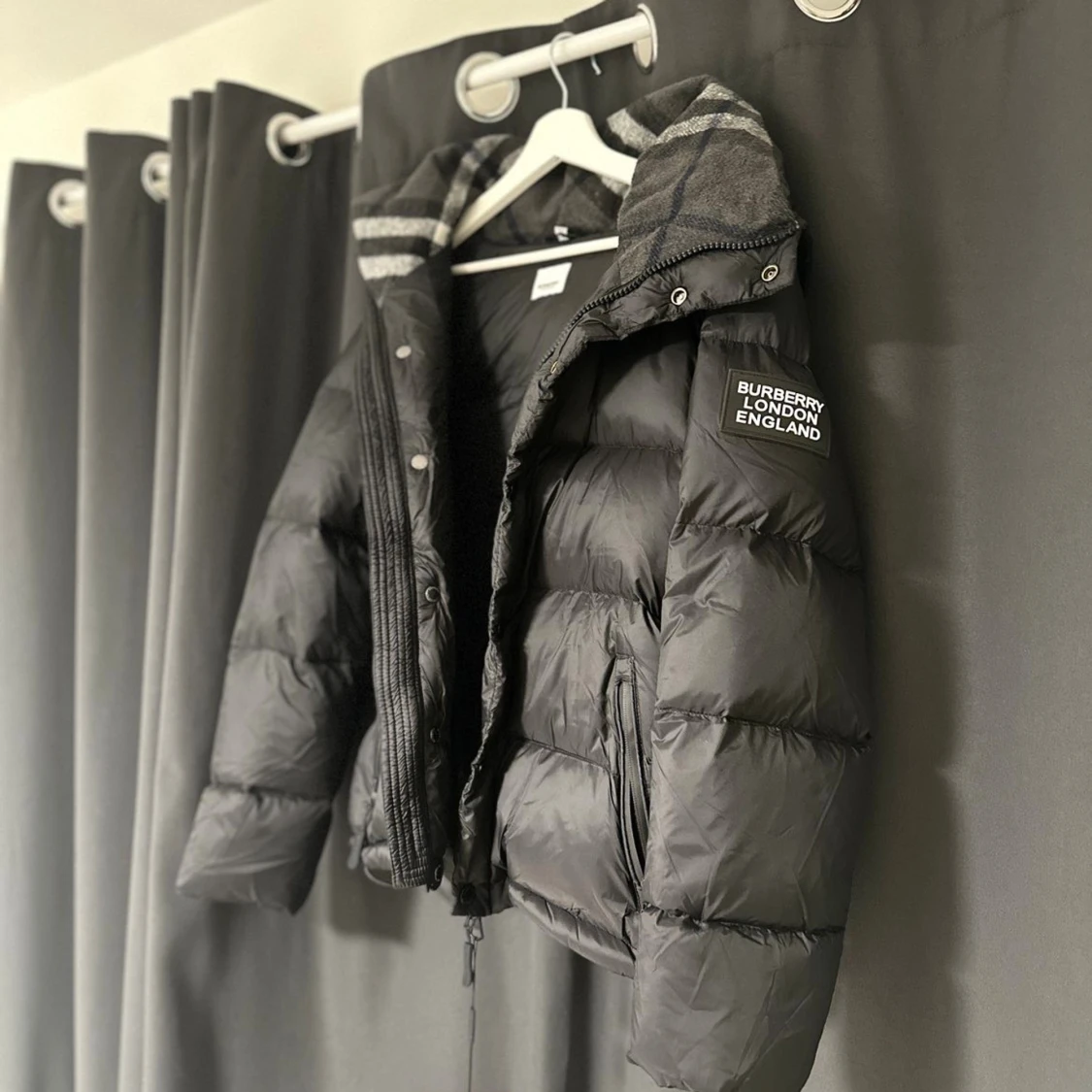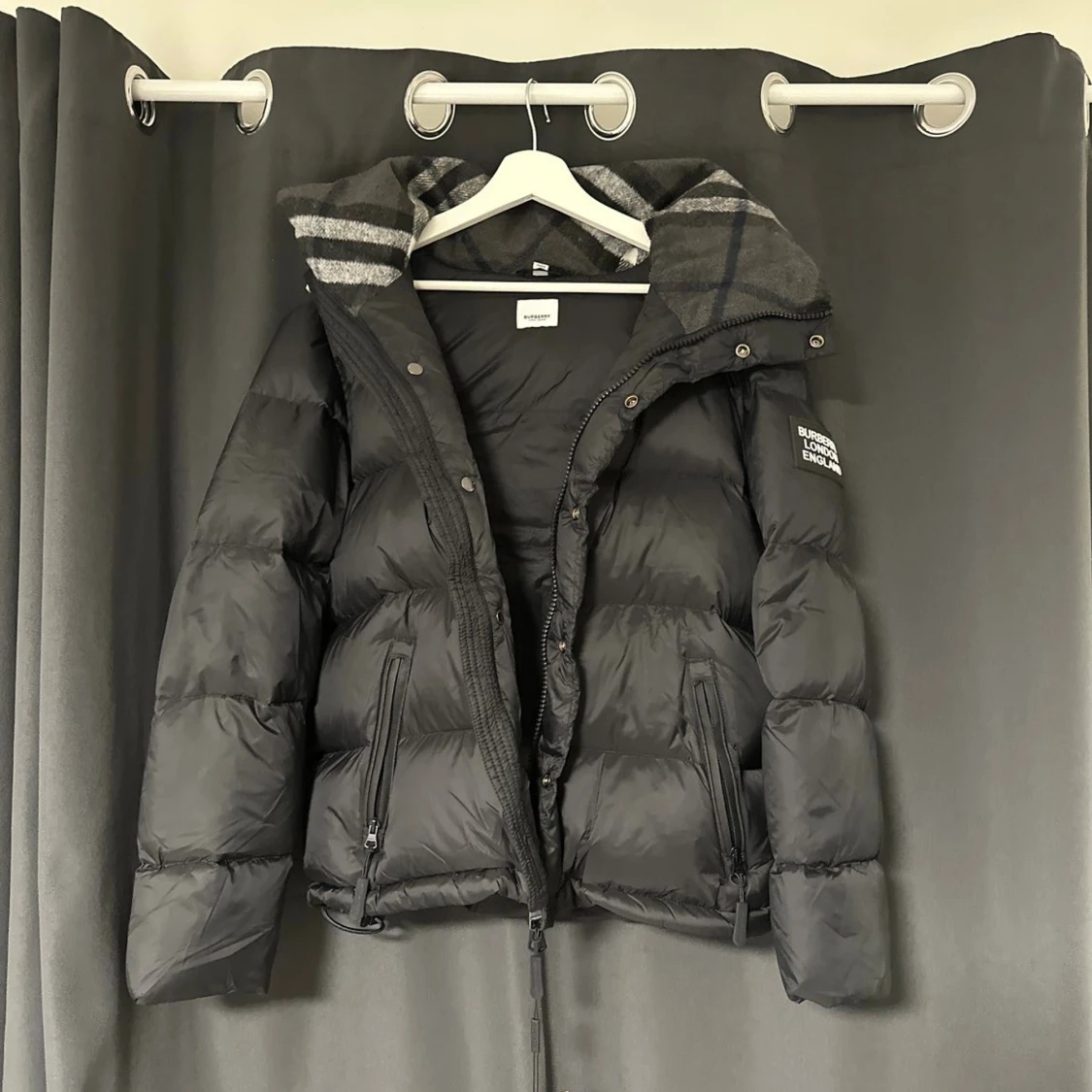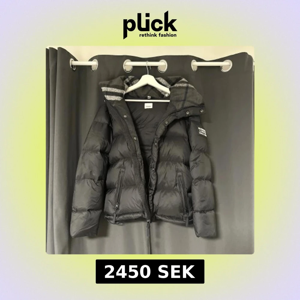 Svart pufferjacka från Burberry med avtagbara ärmar, så den kan användas som väst. Jackan har dragkedja, knappar och två fickor med dragkedja. Insidan av huvan har ett grått rutigt mönster. Patch med Burberry London England på ärmen.
