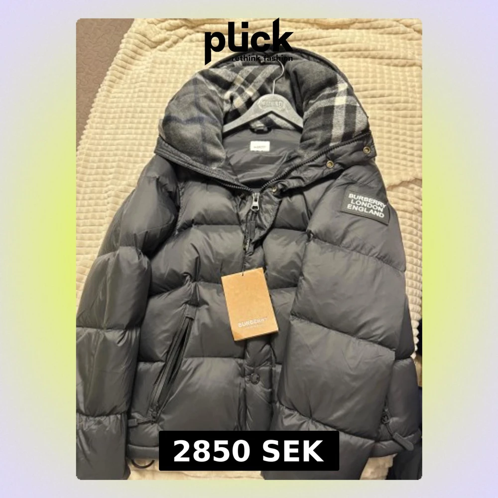 Säljer en svart pufferjacka från Burberry med stor huva och klassiskt rutig foder i grått, vitt och blått. Jackan har dragkedja, sidofickor med zip och Burberry London England-patch på ärmen. Perfekt för kalla dagar och har en riktigt schysst oversized look.