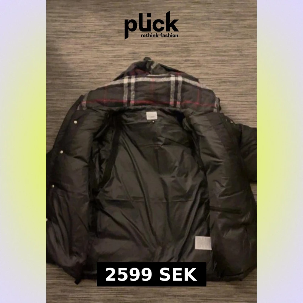 Svart pufferjacka från Burberry med stor huva och klassiskt rutigt foder i grått, vitt och rött. Jackan har dragkedja och knappar framtill, samt två sidofickor med dragkedja. Burberry-logga på bröstet och etikett på insidan. Snygg och varm för kalla dagar.