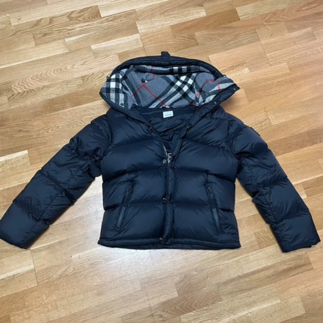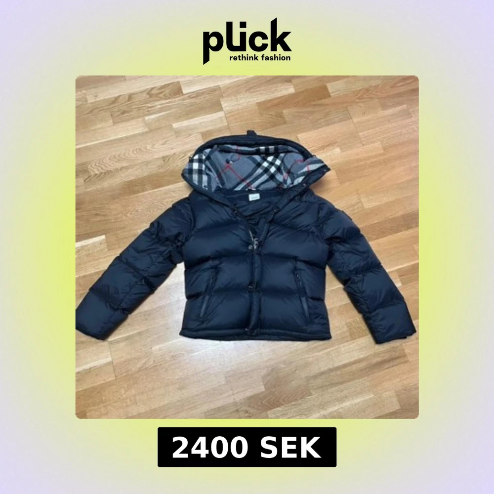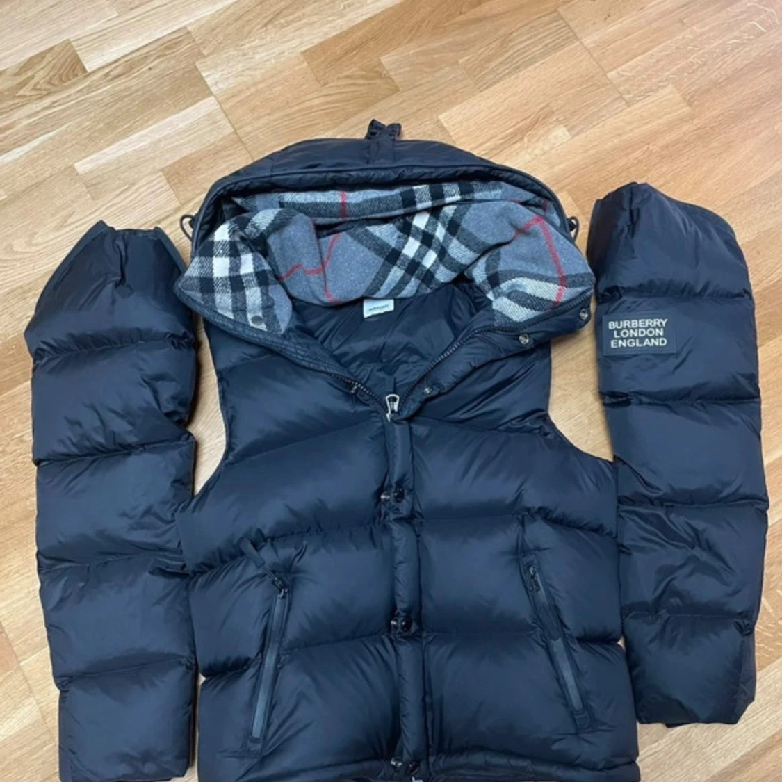 Svart pufferjacka från Burberry med avtagbara ärmar, vilket gör att den kan bäras som väst. Jackan har dragkedja, två fickor framtill och en huva fodrad med klassiskt rutigt Burberry-mönster i grått, vitt och rött. Märkeslogga på ena ärmen.