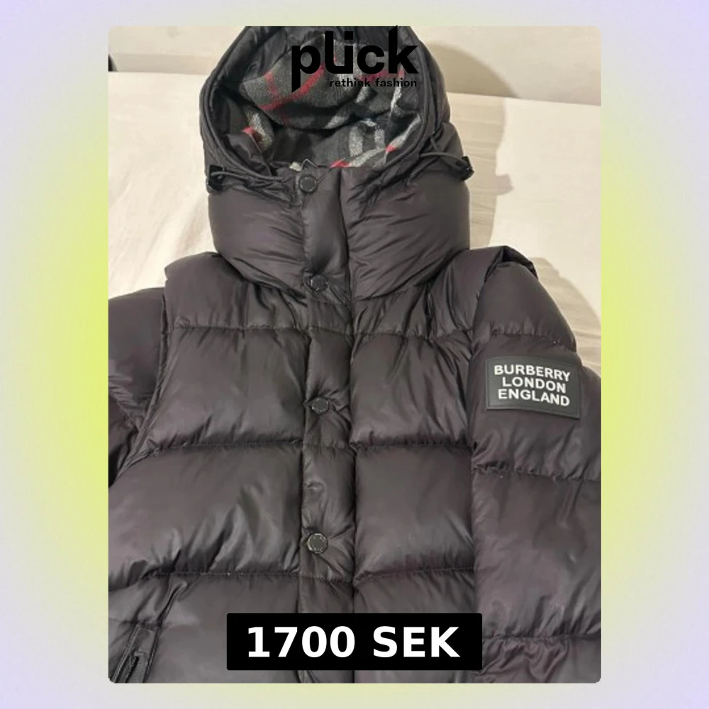 Svart pufferjacka från Burberry London England med avtagbara ärmar så den kan användas som väst. Jackan har huva med rutigt foder i grått och rött, knappar framtill och dragkedja i fickan. Perfekt för kalla dagar och har en riktigt schysst streetstil. Ett fel me vänster ficka på dragkedjan.