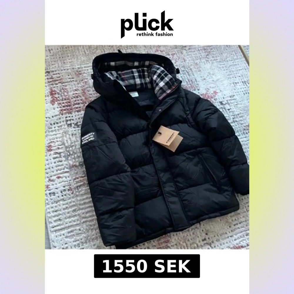 Svart pufferjacka från Burberry med huva och rutig innerfoder i svart, vitt och rött. Jackan har Burberry-logga på ärmen och dragkedja framtill. Perfekt för kalla dagar och har en modern, boxig passform.