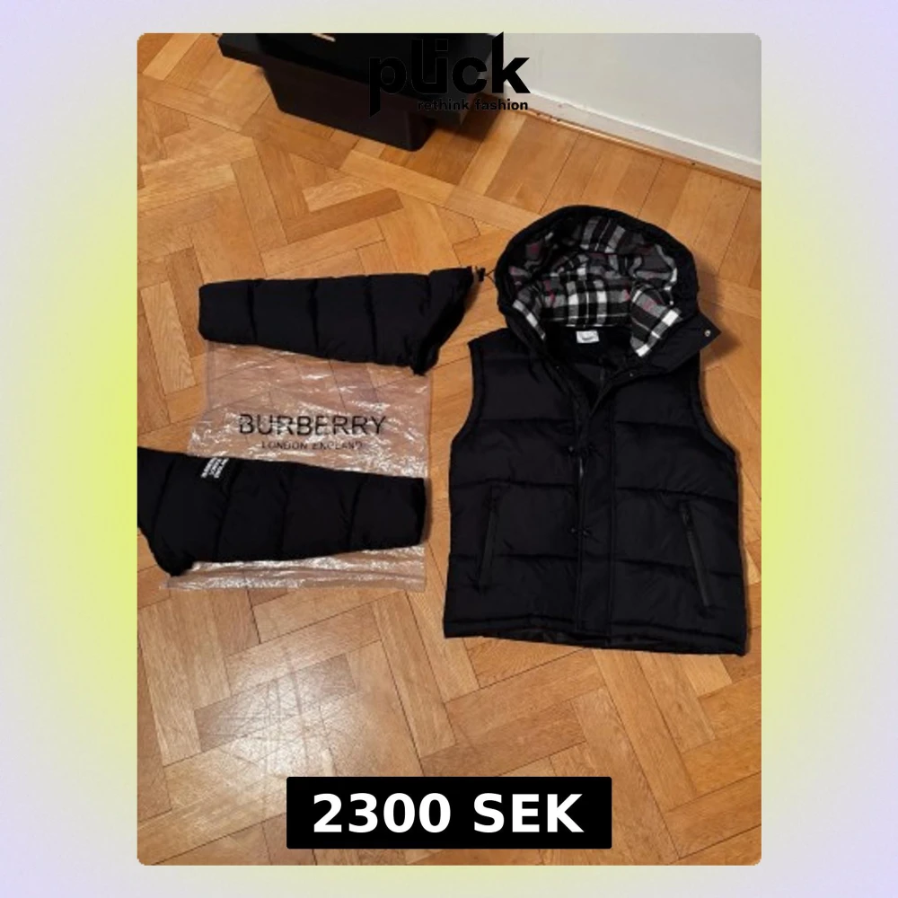 Svart pufferjacka från Burberry med avtagbara ärmar så du kan bära den som väst. Jackan har huva med klassiskt rutigt foder i grått, vitt och rött, samt två dragkedjefickor fram. Burberry-logga på vänster ärm. Perfekt för kalla dagar.