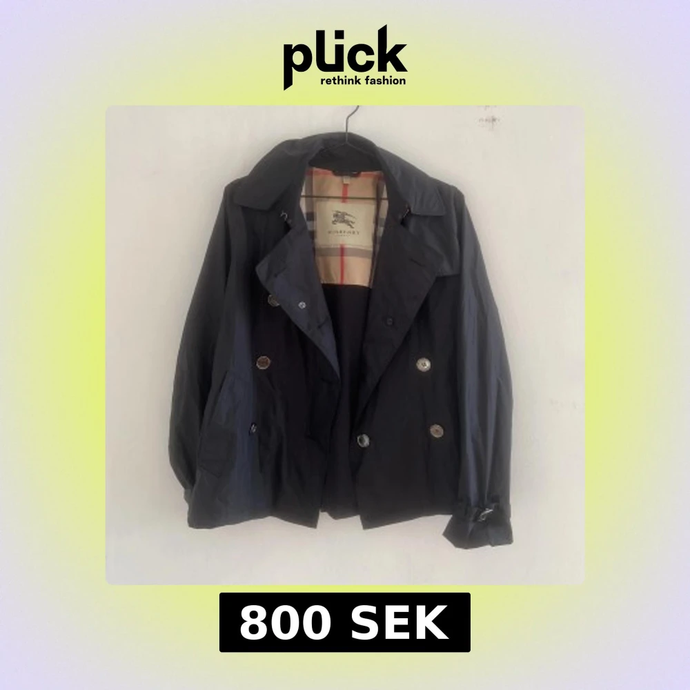 kort kappa/trenchcoat från Burberry. strl L/M. Köpt sekundhand för liknande pris, men har ingen garanti för äkthet. En sömn som är tidigare lagad, men inga andra defekter!