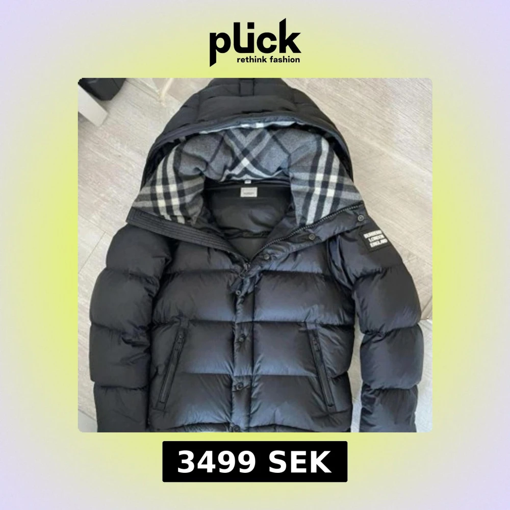Snygg svart dunjacka från Burberry med klassiskt rutigt foder i grå toner. Jackan har huva, dragkedja och knappar framtill samt två fickor med dragkedja. Perfekt för kalla dagar och riktigt stilren look. Storlek XL men passar L