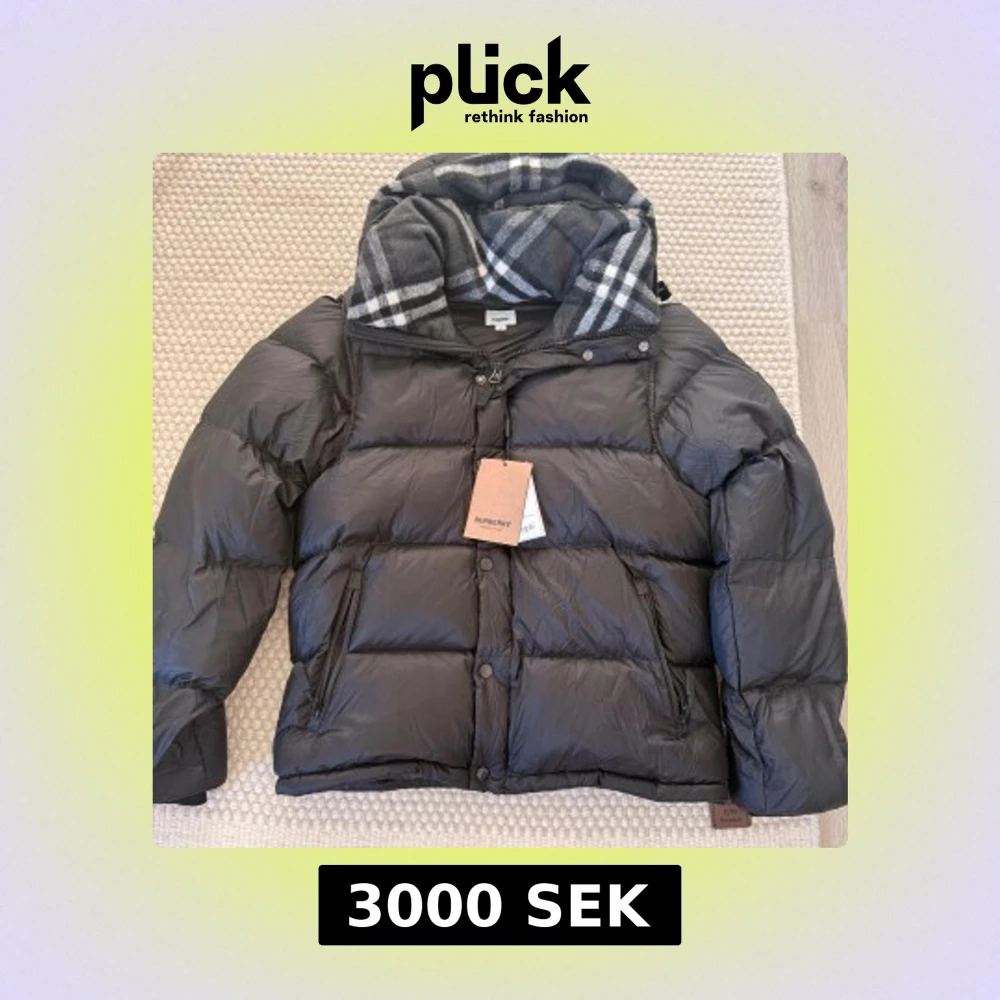 Svart pufferjacka från Burberry i storlek XL. Jackan har en stor huva med grått och vitt rutigt mönster, dragkedja och knappar framtill samt två sidofickor med dragkedja. Materialet är polyester och polyamid, med detaljer i bomull och merinoull.