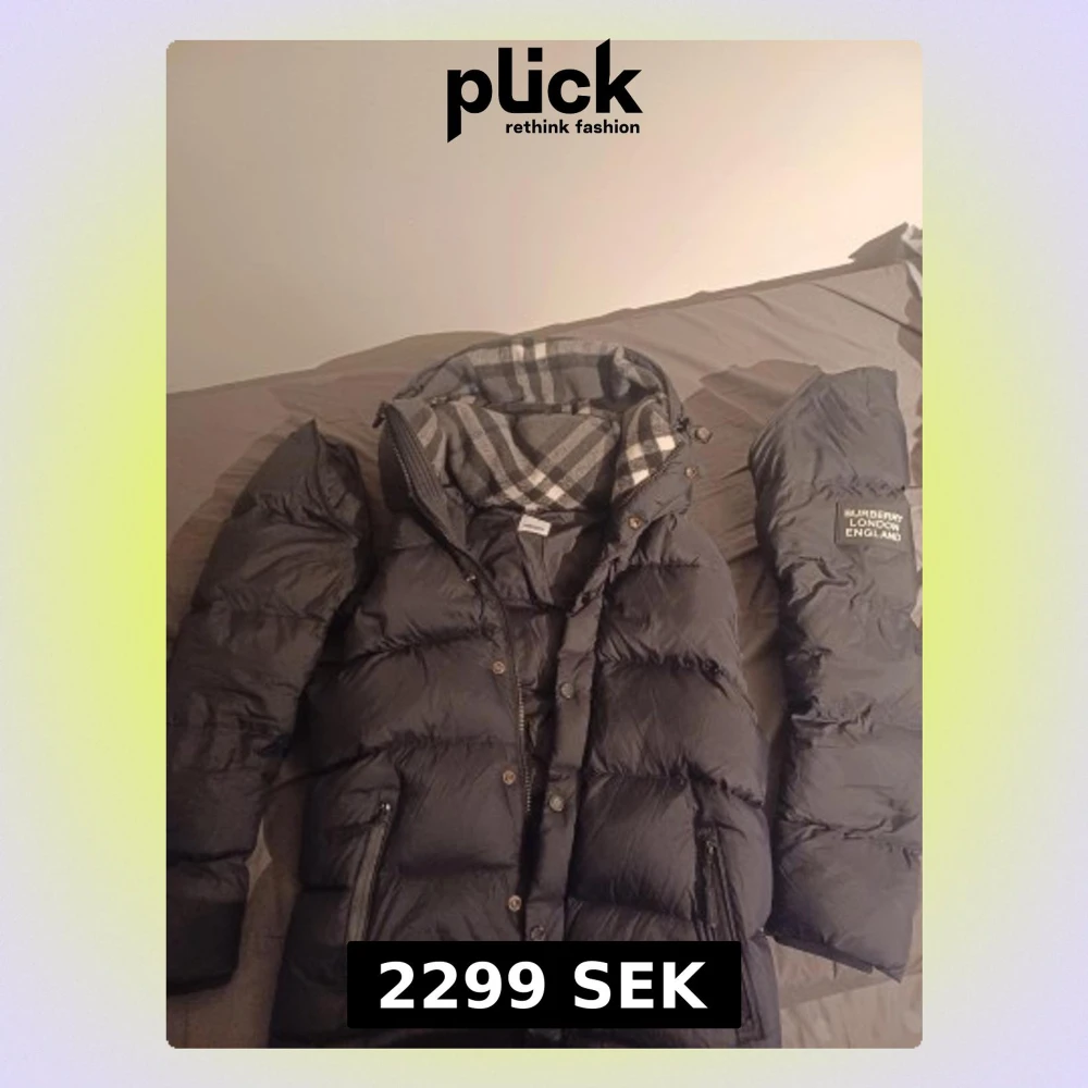 Snygg svart dunjacka från Burberry med klassiskt rutigt foder i grå toner. Jackan har huva, dragkedja och knappar framtill samt två fickor med dragkedja. Perfekt för kalla dagar och riktigt stilren look. Storlek XL men passar L