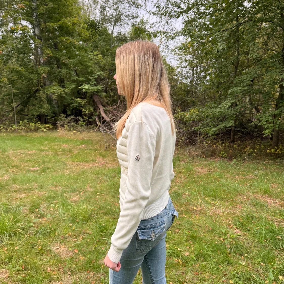 Säljer en beige cardigan jacka från Moncler med quiltad front och mjuka stickade ärmar.Intreserad av byten mot andra moncler cardigan!! Jackan har dragkedja, ribbade muddar och Moncler-logga på ärmen. Perfekt för dig som gillar stilren och chill look. Fråga om du vill ha fler bilder eller info!