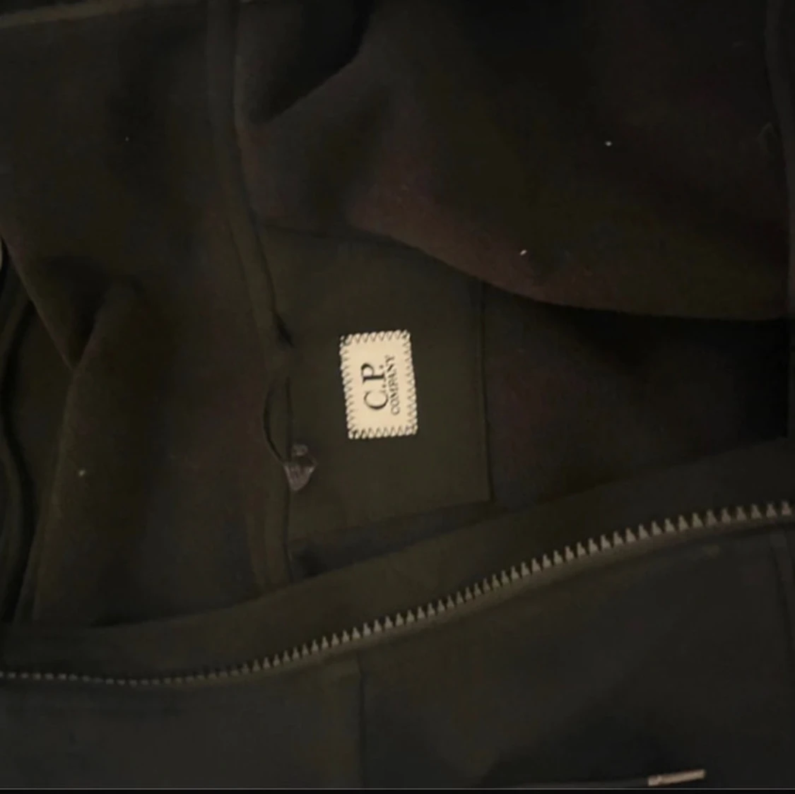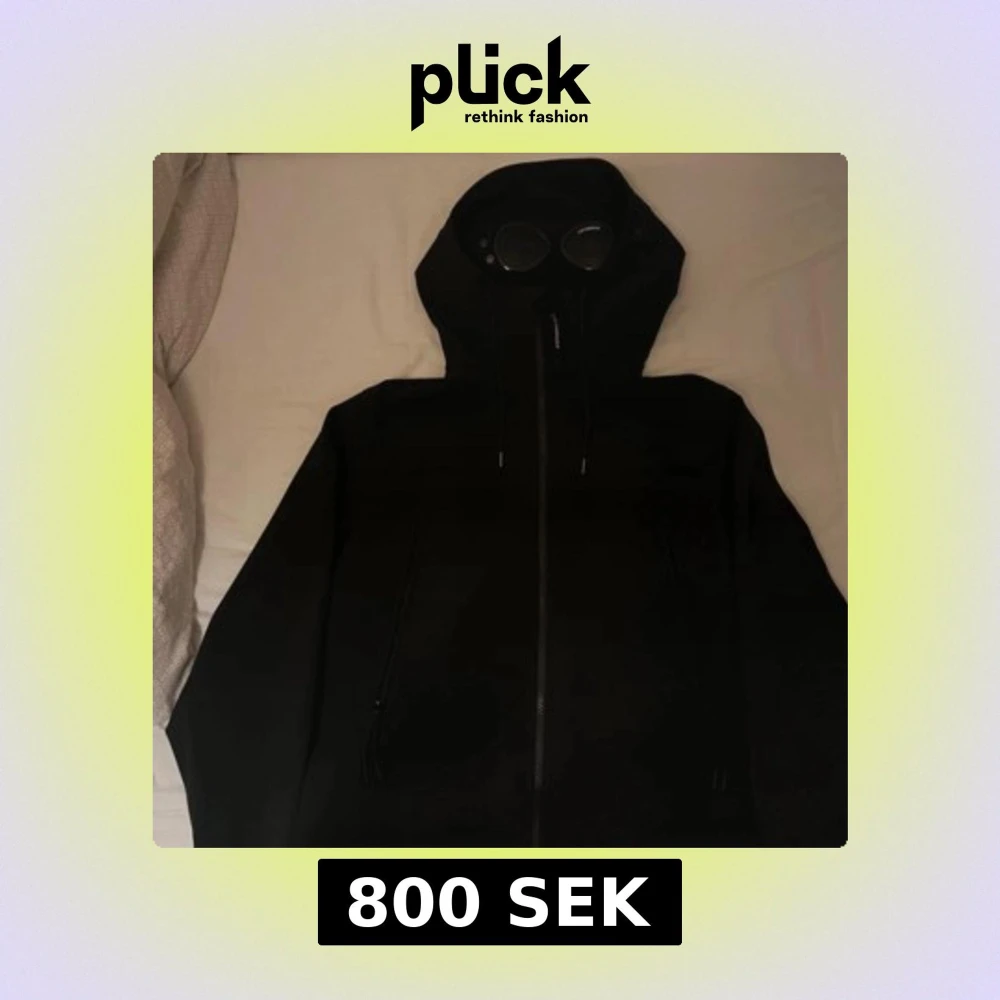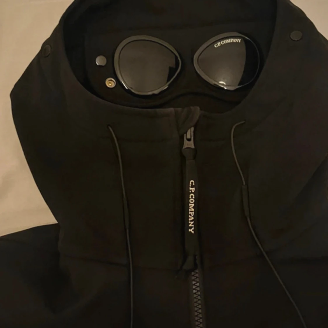 Svart Goggle Jacket från C.P. Company med ikoniska glasögon i huvan. Jackan har hel dragkedja framtill, två sidofickor med dragkedja och justerbar huva med snörning. Snygg och stilren design, perfekt för dig som gillar streetwear och unika detaljer. Säljer då den ej passar mig oanvänd —- storlek L men mer som S-M