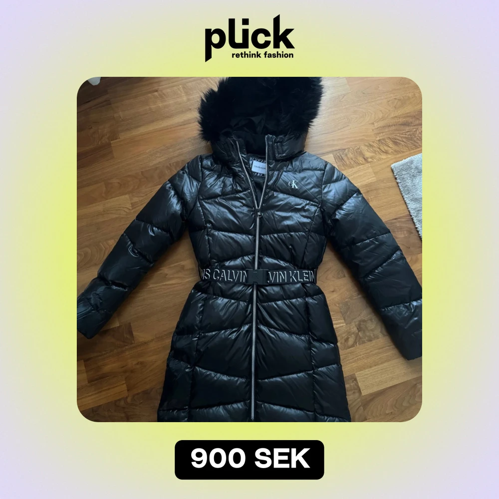 Säljer en snygg svart dunjacka från Calvin Klein. Jackan har en fluffig huva och ett bälte med logga i midjan. Den är perfekt för kalla vinterdagar och har en dragkedja framtill. Jackan är i nyskick och håller dig varm och stilren hela säsongen.