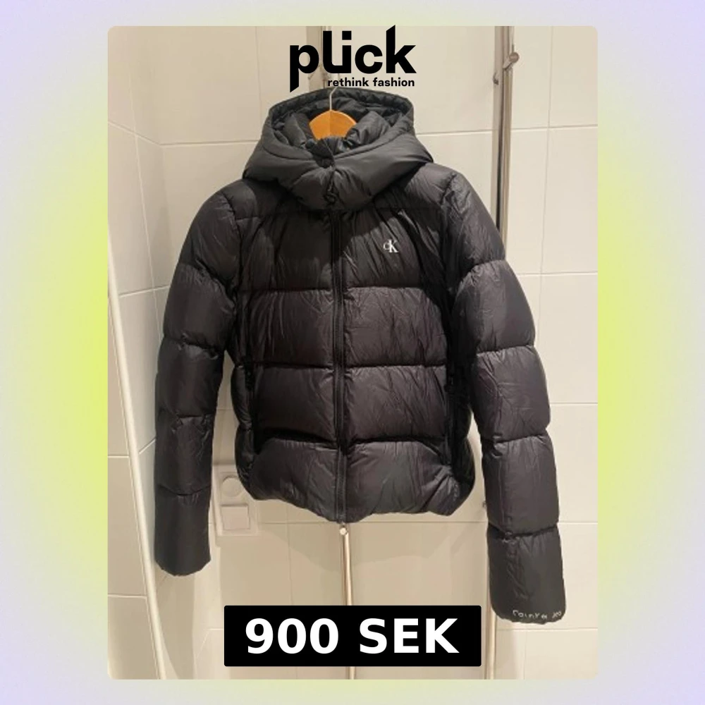 Svart pufferjacka från Calvin Klein med avtagbar huva och diskret CK-logga på bröstet. Storlek S. Nypris 2595 kr.