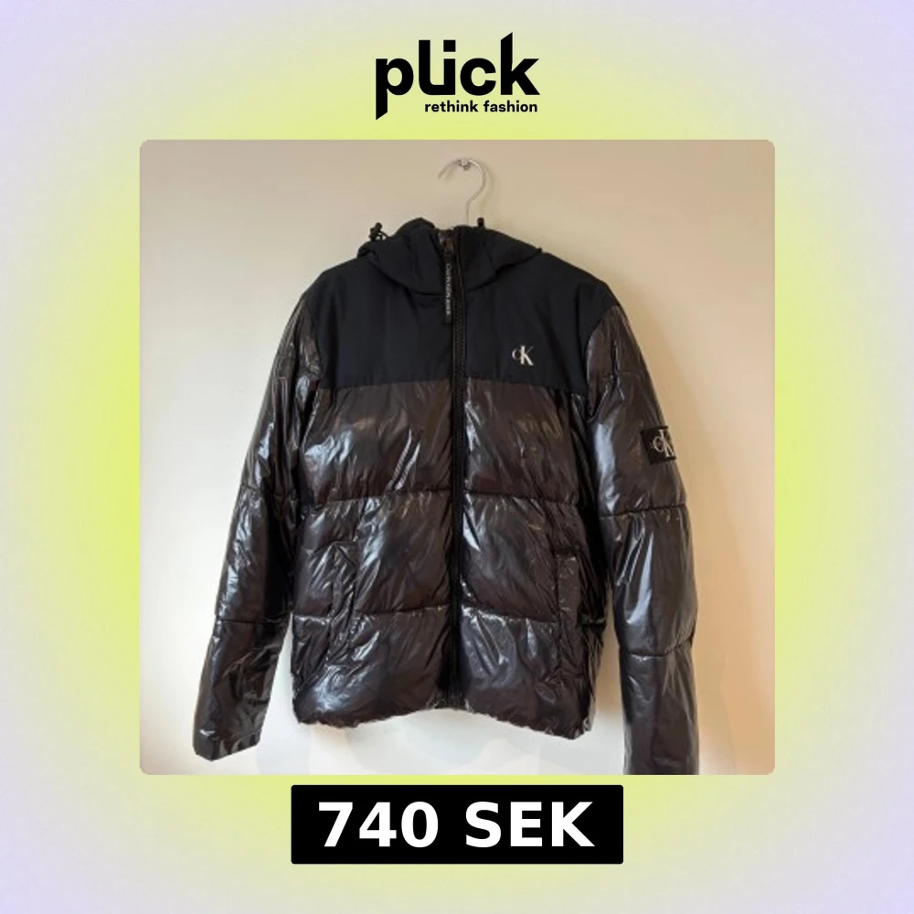 En svart pufferjacka från Calvin Klein med glansig finish och huva. Jackan har dragkedja framtill, två stora fickor och diskret CK-logga på bröstet och ärmen. .