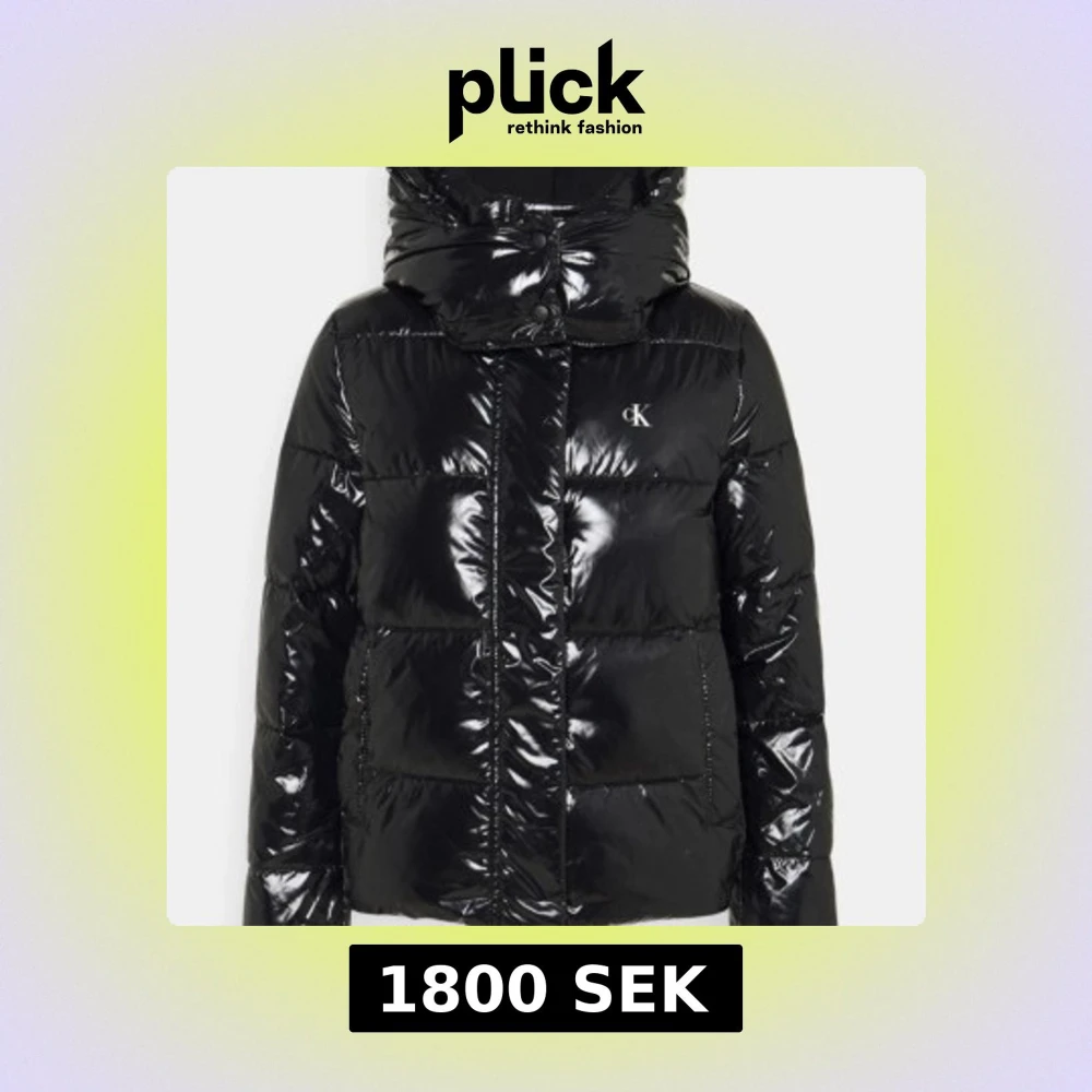 Säljer en svart glansig pufferjacka från Calvin Klein med huva och diskret CK-logga på bröstet. Jackan har dragkedja och knappar framtill samt långa ärmar. Perfekt för kyliga dagar och riktigt snygg till jeans.