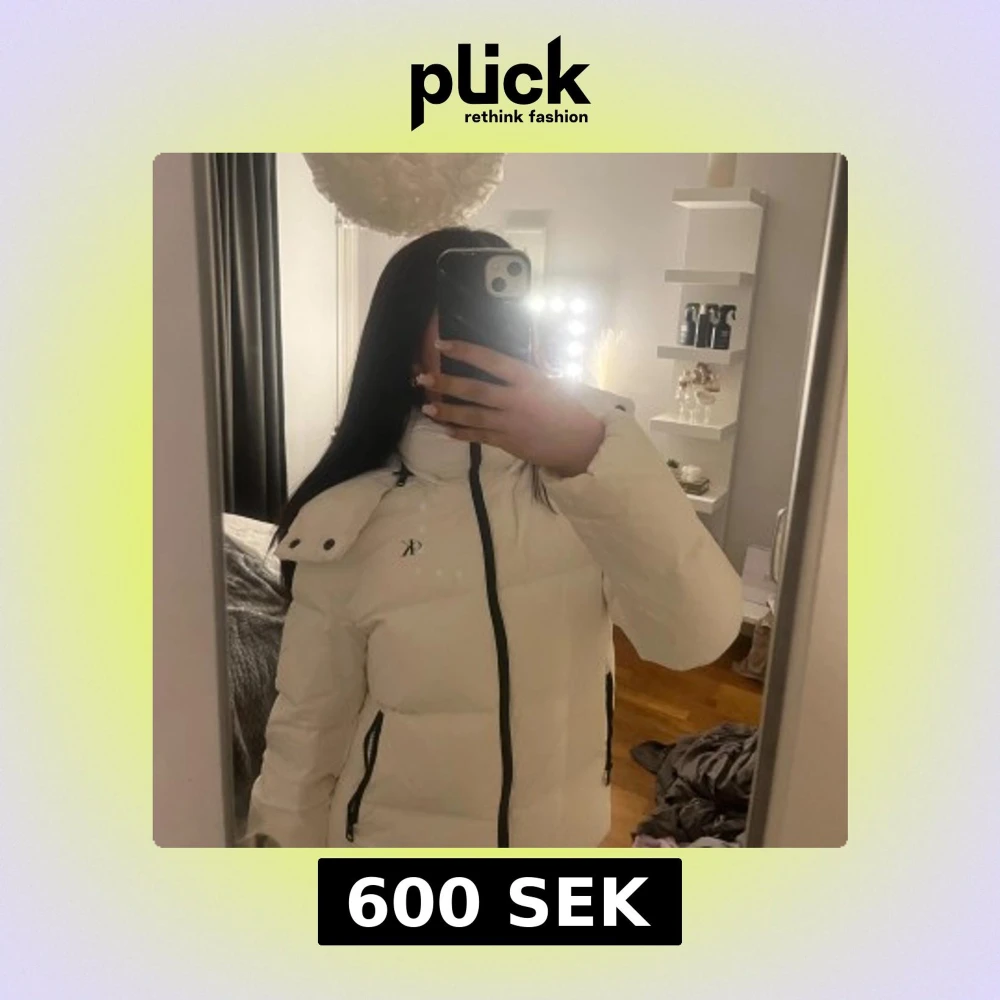 Säljer en snygg vit dunjacka med hög krage och dragkedja. Jackan har en stilren design med svarta detaljer och praktiska fickor. Perfekt för kyliga dagar.
