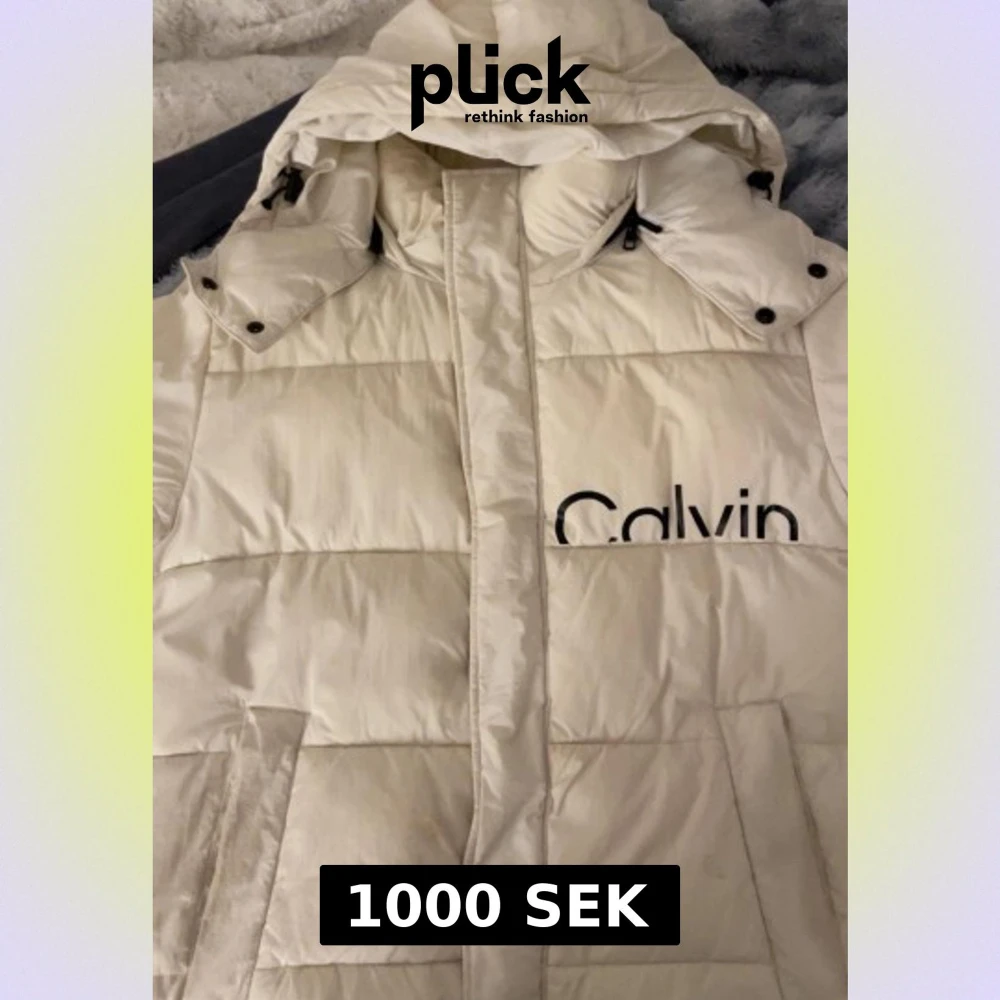 Säljer en snygg vit pufferjacka från Calvin Klein med stor huva och svart logga på bröstet. Jackan har långa ärmar, dragkedja och praktiska fickor. Perfekt för kalla dagar och har en clean, modern look.