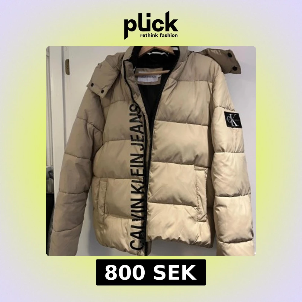 Säljer en beige pufferjacka från Calvin Klein Jeans med stor svart logga längs dragkedjan och patch på ärmen. Jackan har huva, svarta detaljer och är quiltad för extra värme. Perfekt för kalla dagar och har en clean, modern look. Jackan är som ny använd max 2 gånger. Utgångspris 1500