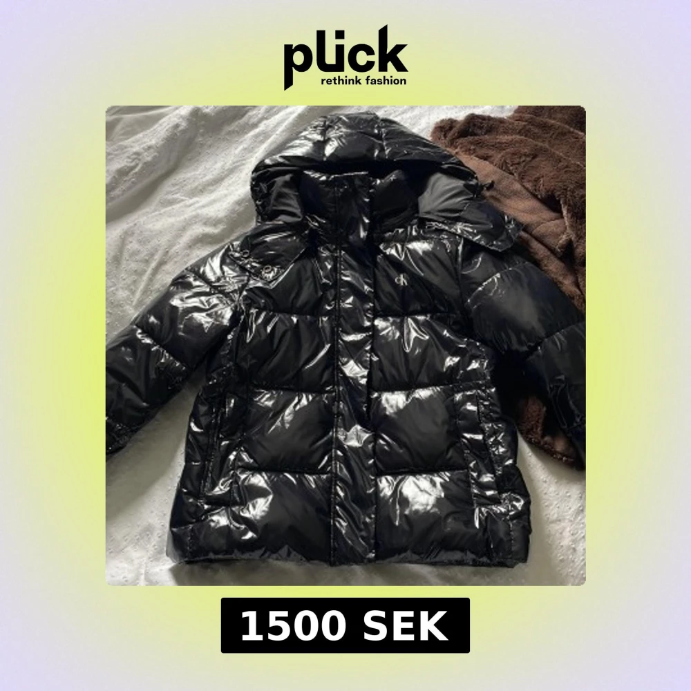 Säljer en svart, glansig pufferjacka från Calvin Klein Jeans med huva och dragkedja. Jackan har logga på bröstet och ärmen, quiltad design och är perfekt för kalla dagar. Oversized känsla och riktigt snygg streetstil.