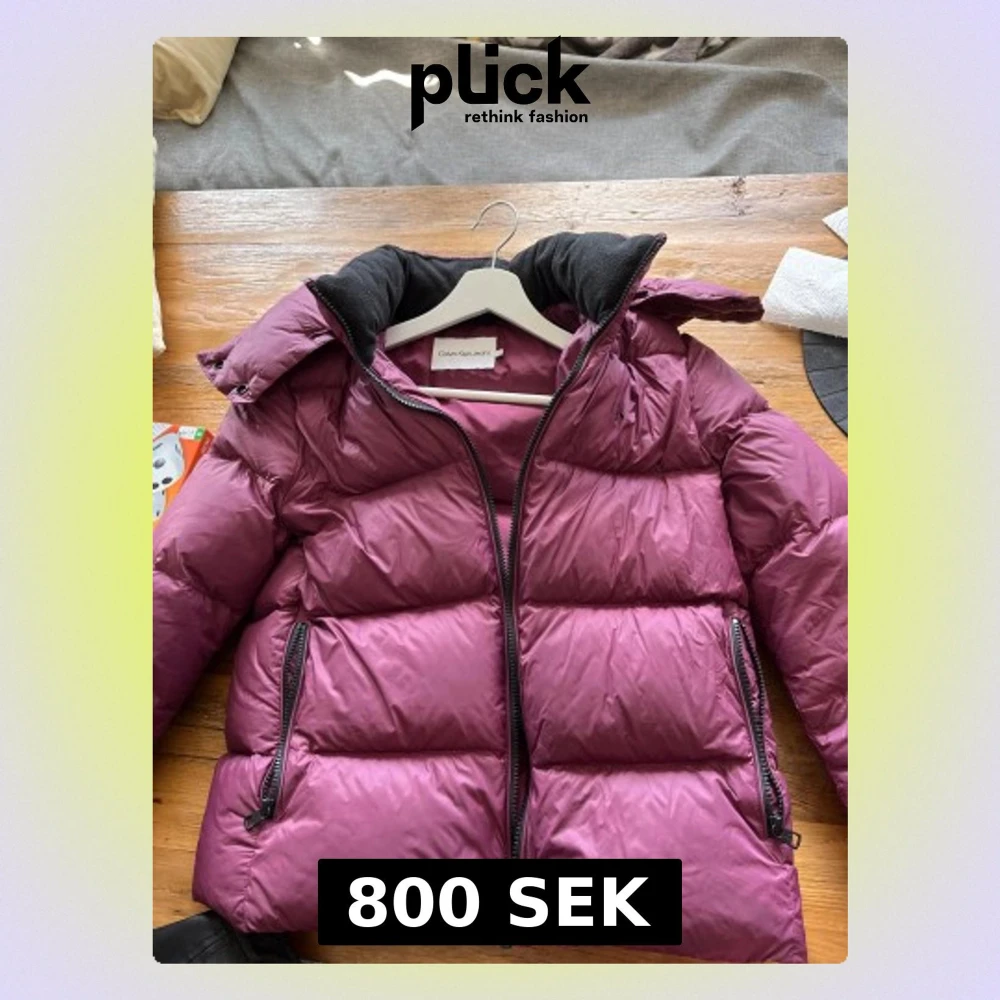Säljer en snygg lila pufferjacka från Calvin Klein Jeans i storlek M. Jackan har hög krage, huva och två fickor med dragkedja. Materialet är polyester och jackan har en quiltad look med breda paneler. Perfekt för kalla dagar och riktigt trendig färg.