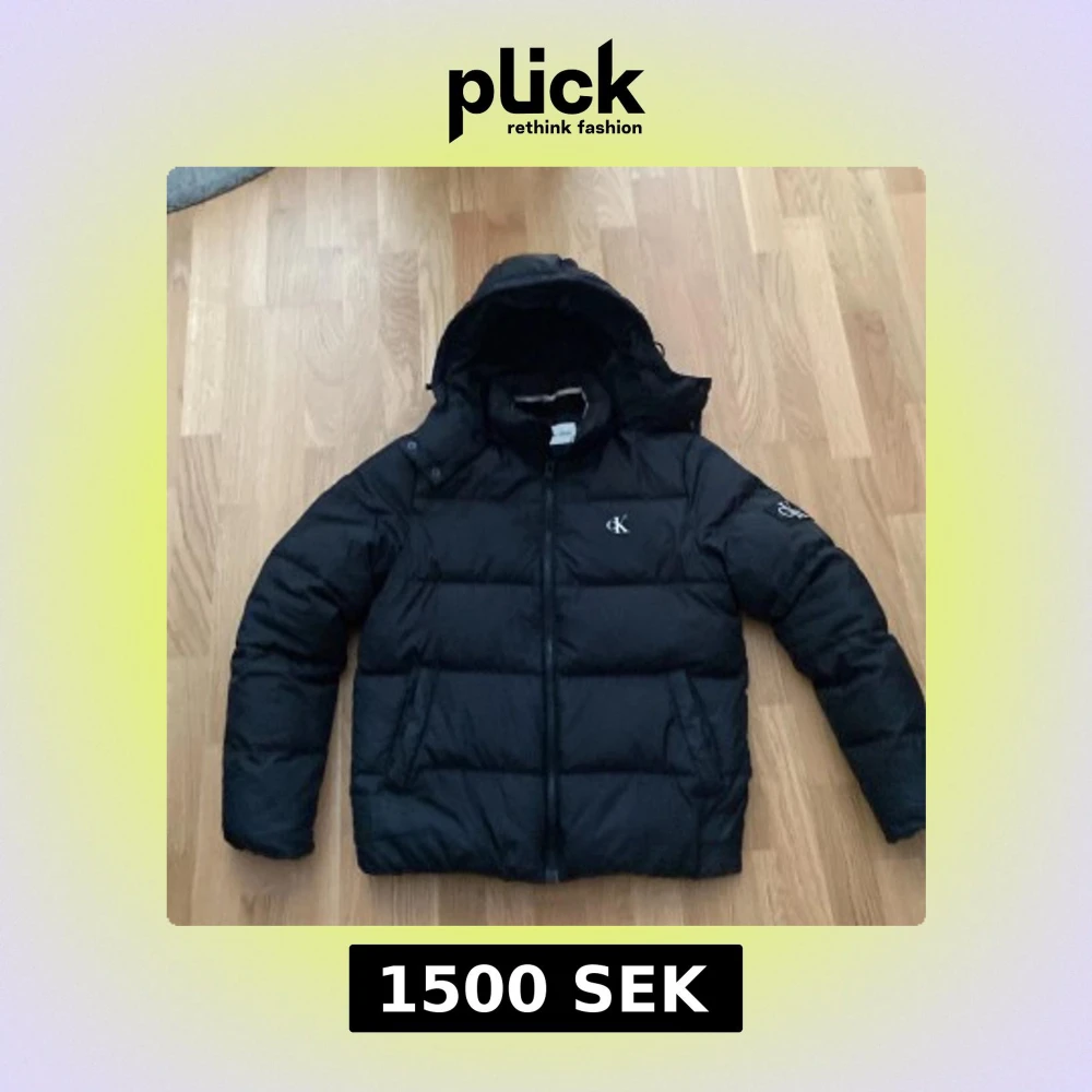 Säljer en svart pufferjacka från Calvin Klein Jeans med huva och dragkedja. Jackan har broderad CK-logga på bröstet och patch på ärmen. Insidan är fodrad i vitt med stor Calvin Klein Jeans-tryck. Tillverkad i 100% polyester, perfekt för kalla dagar.