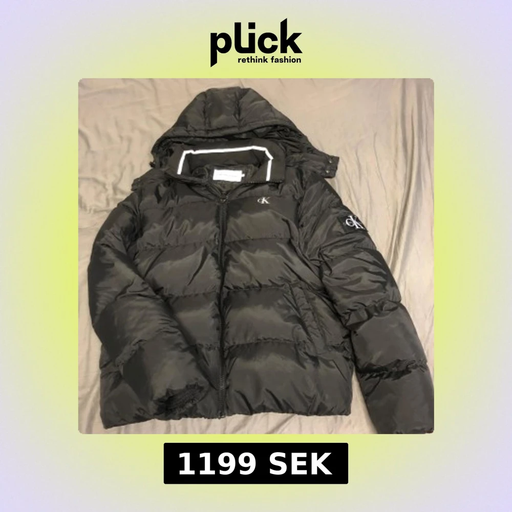 Säljer en svart pufferjacka från Calvin Klein Jeans med huva och dragkedja. Jackan har CK-logga på bröstet och ärmen. Perfekt för kyliga dagar.