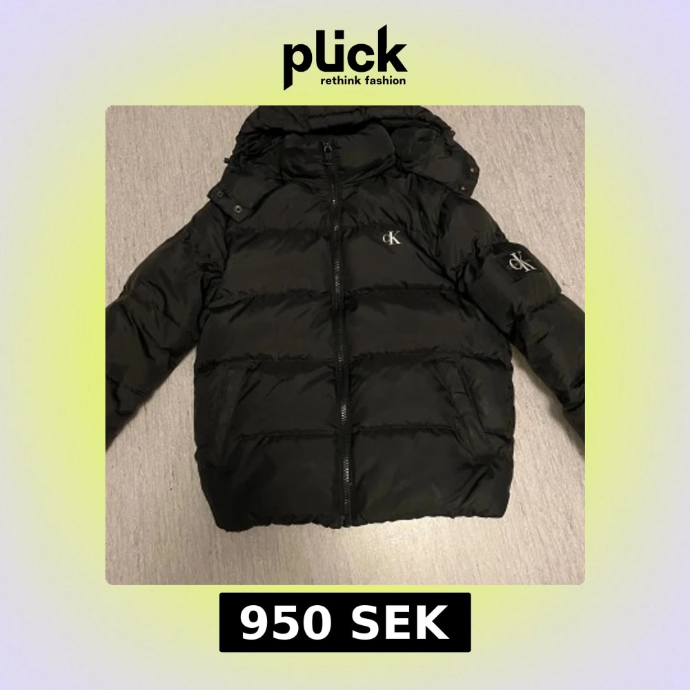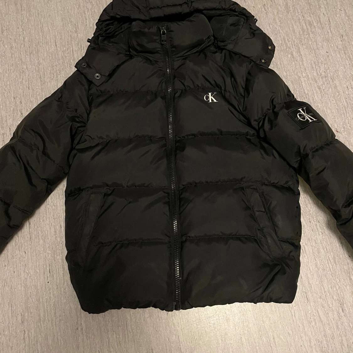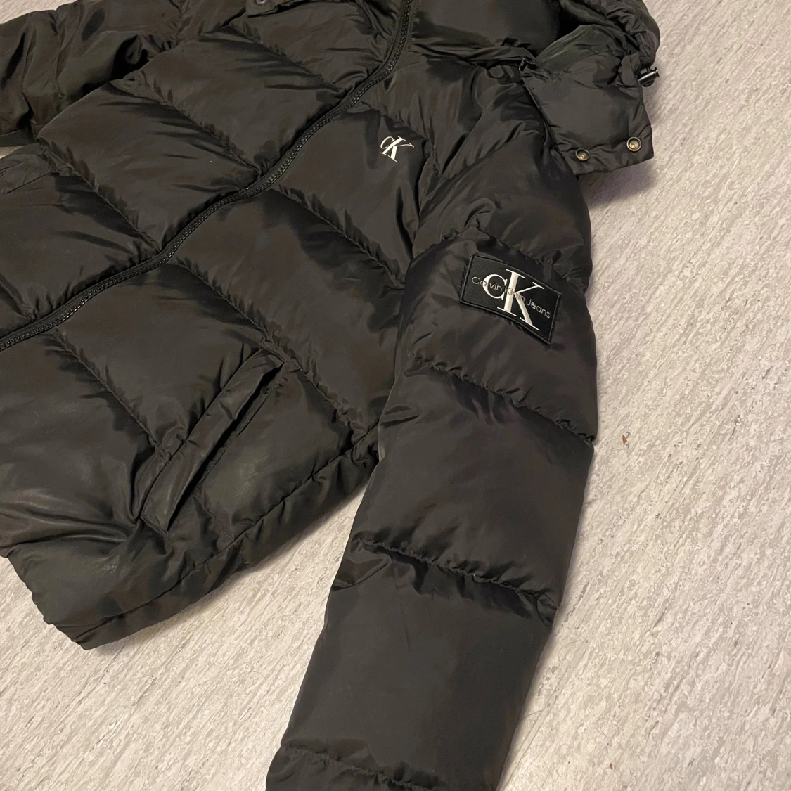 Svart pufferjacka från Calvin Klein med huva och dragkedja framtill. Jackan har CK-logga på bröstet och ärmen, samt två sidofickor. Puffad design med horisontella sömmar och hög krage. Perfekt för kalla dagar och riktigt snygg streetstil. En liten defekt som visas på sista bilden, skriv vid frågor!