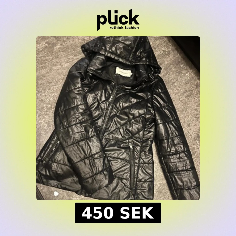 Svart pufferjacka från Calvin Klein med glansig finish, huva och dragkedjor både framtill och vid fickorna.