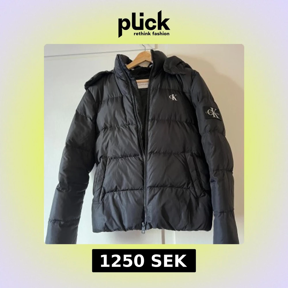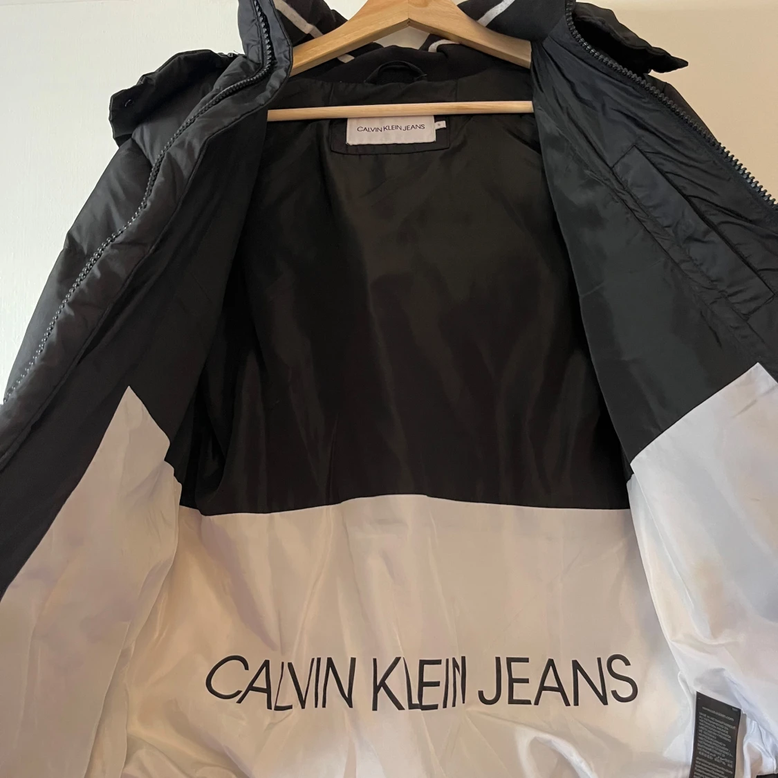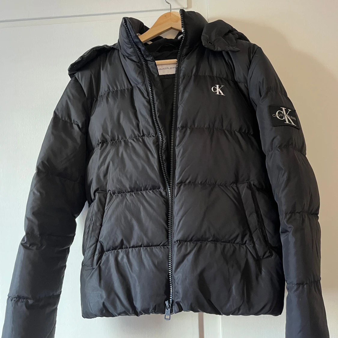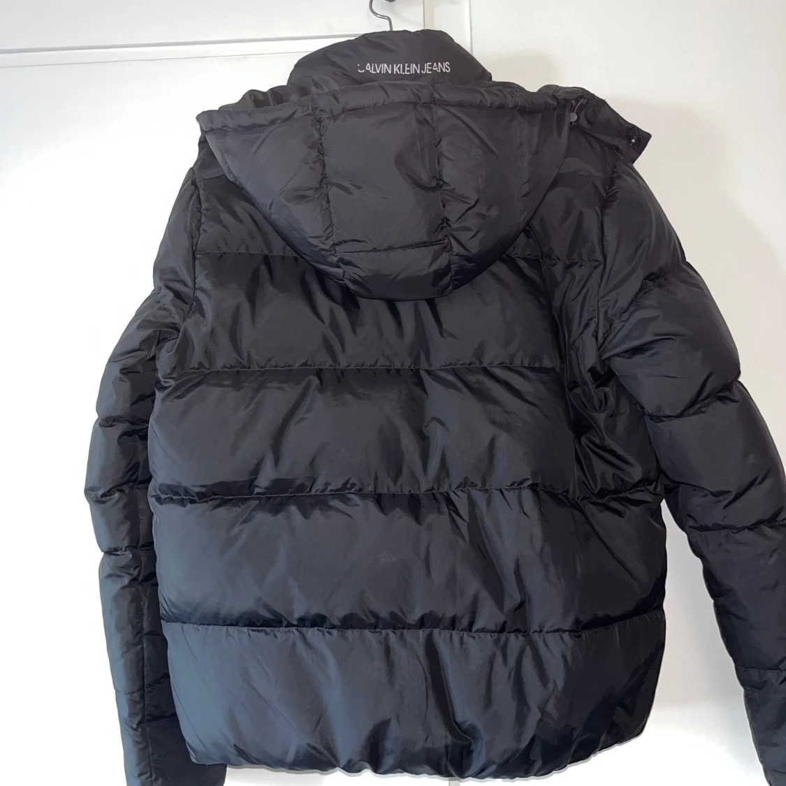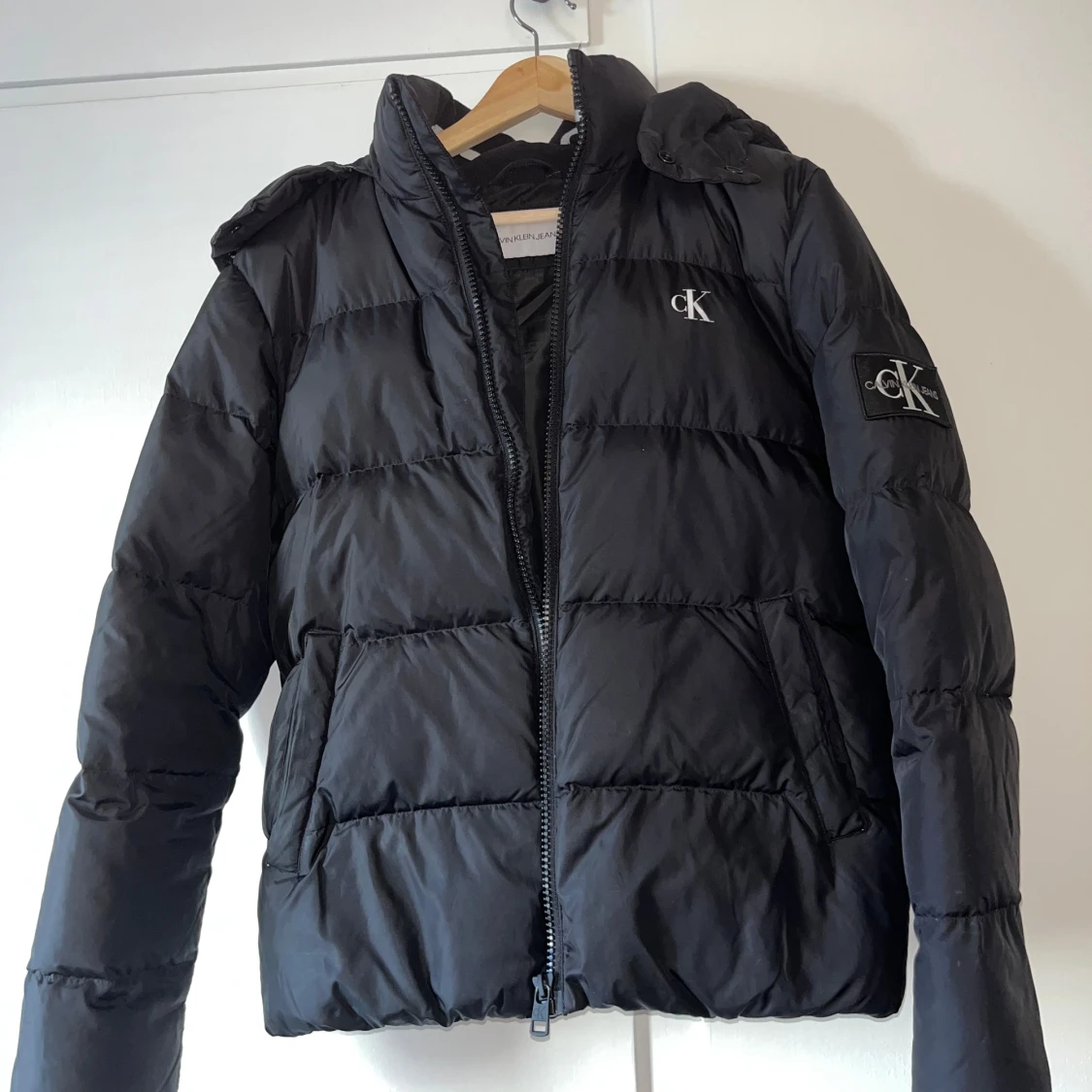 Snygg svart vinterjacka från Calvin Klein med dragkedja och huva. Storlek S. Jackan är äkta och har använts flera gånger men är fortfarande i mycket bra skick