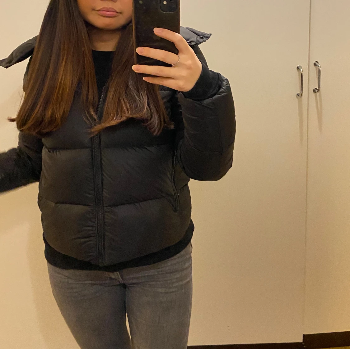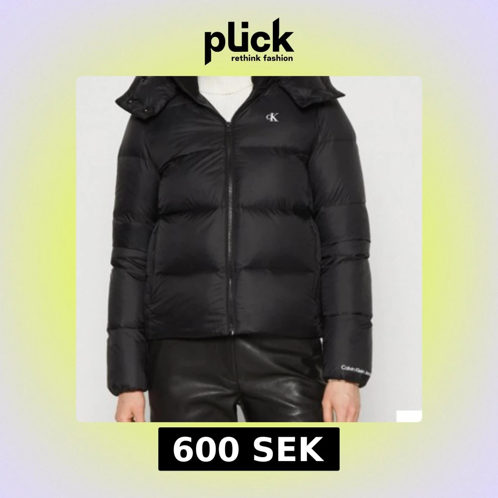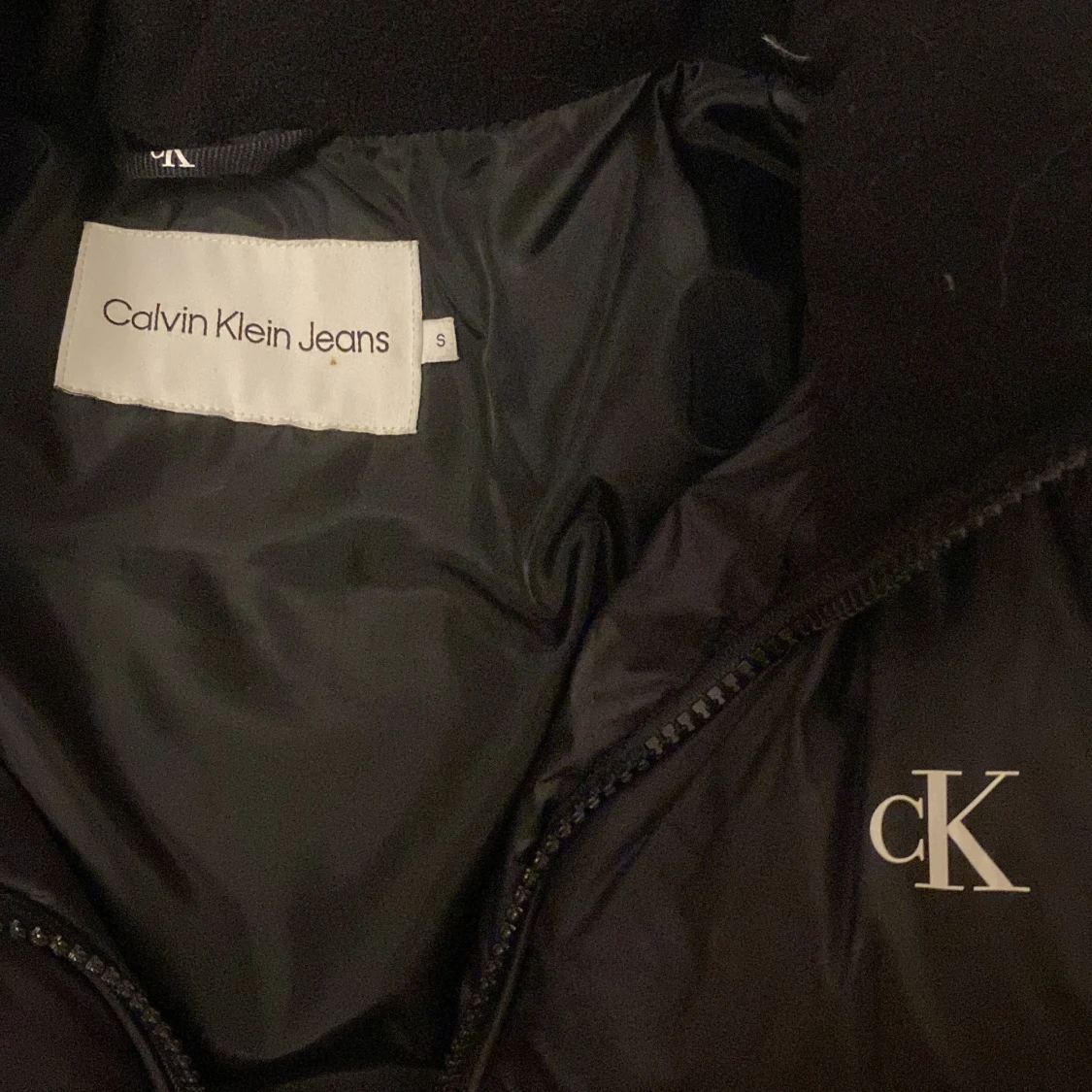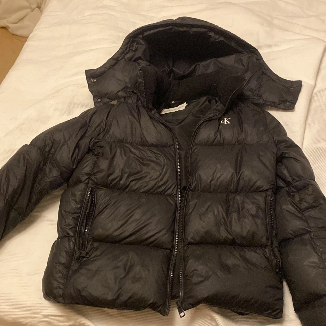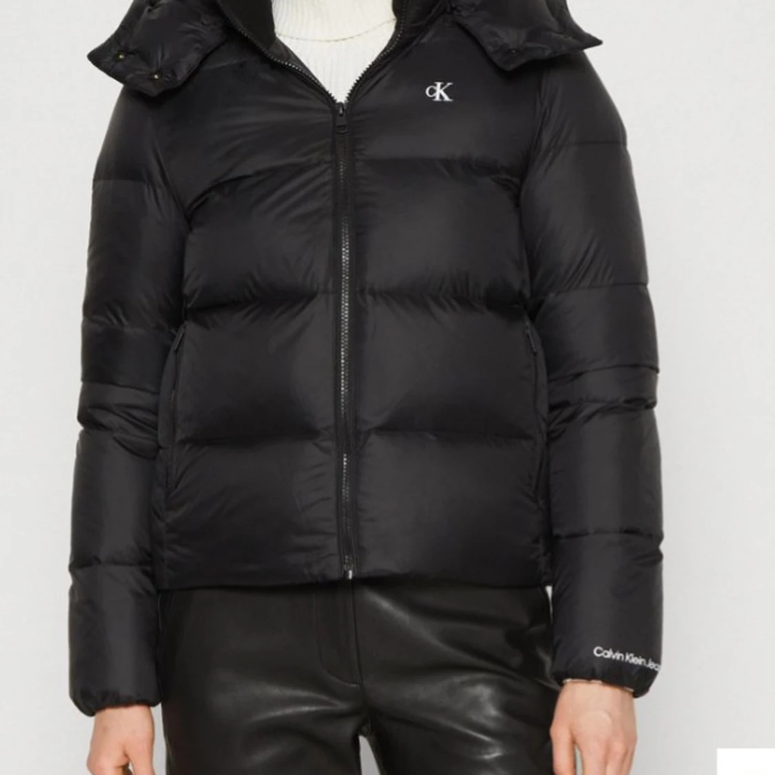 Svart pufferjacka från Calvin Klein Jeans med diskret logga på bröstet och ärmen. Jackan har dragkedja framtill, hög krage och avtagbar huva. Tillverkad i glansig polyester och har en klassisk, boxig passform som är både varm och snygg till vintern. Använd få gånger. Köptes för 2000kr men säljer för 600kr