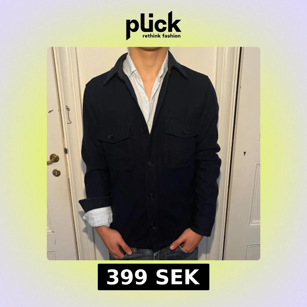 Snygg mörkblå overshirt från Calvin Klein med klassisk krage och två stora bröstfickor med knappar. Jackan är i ullblandning .