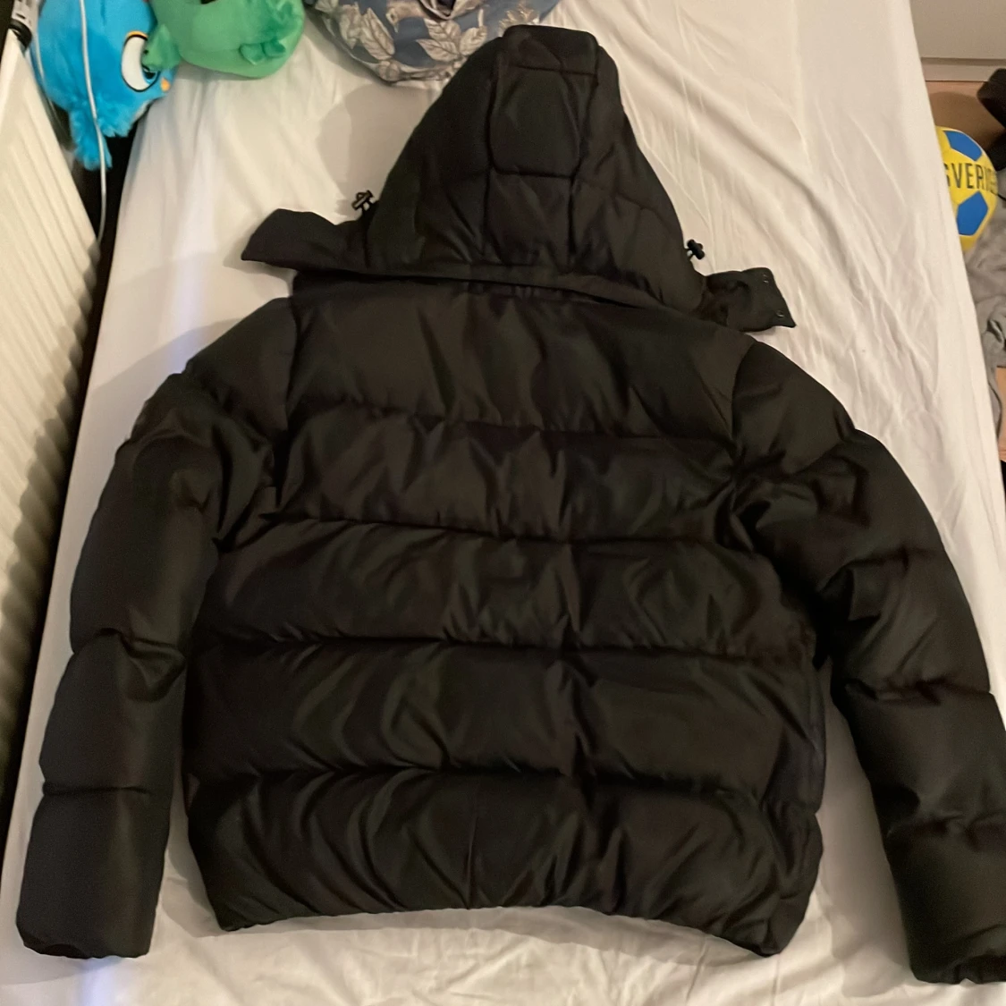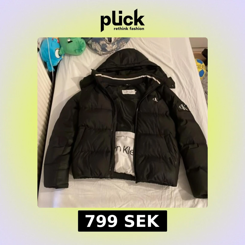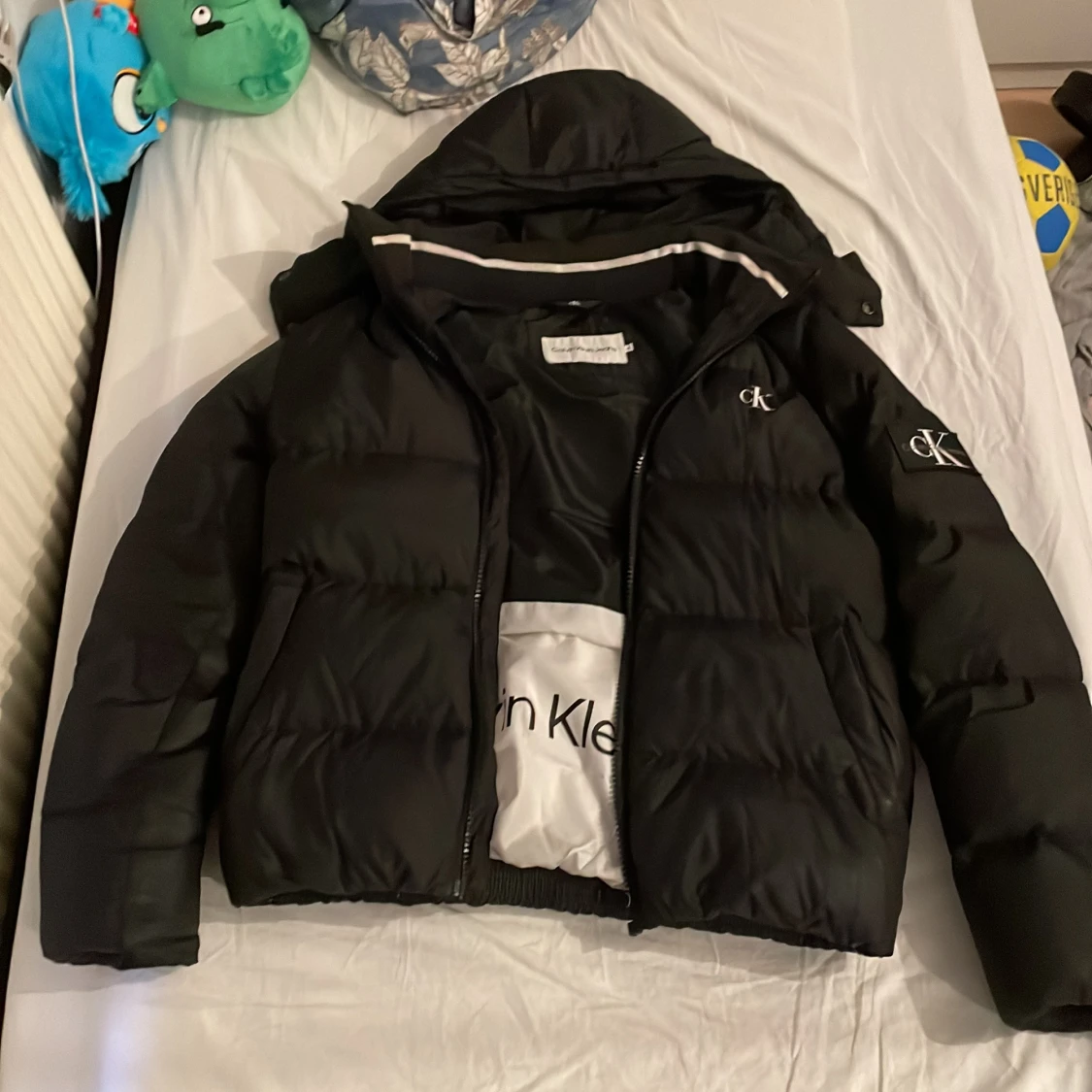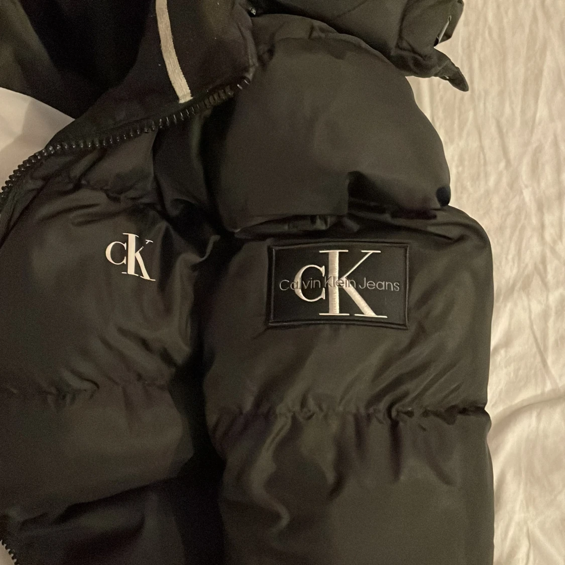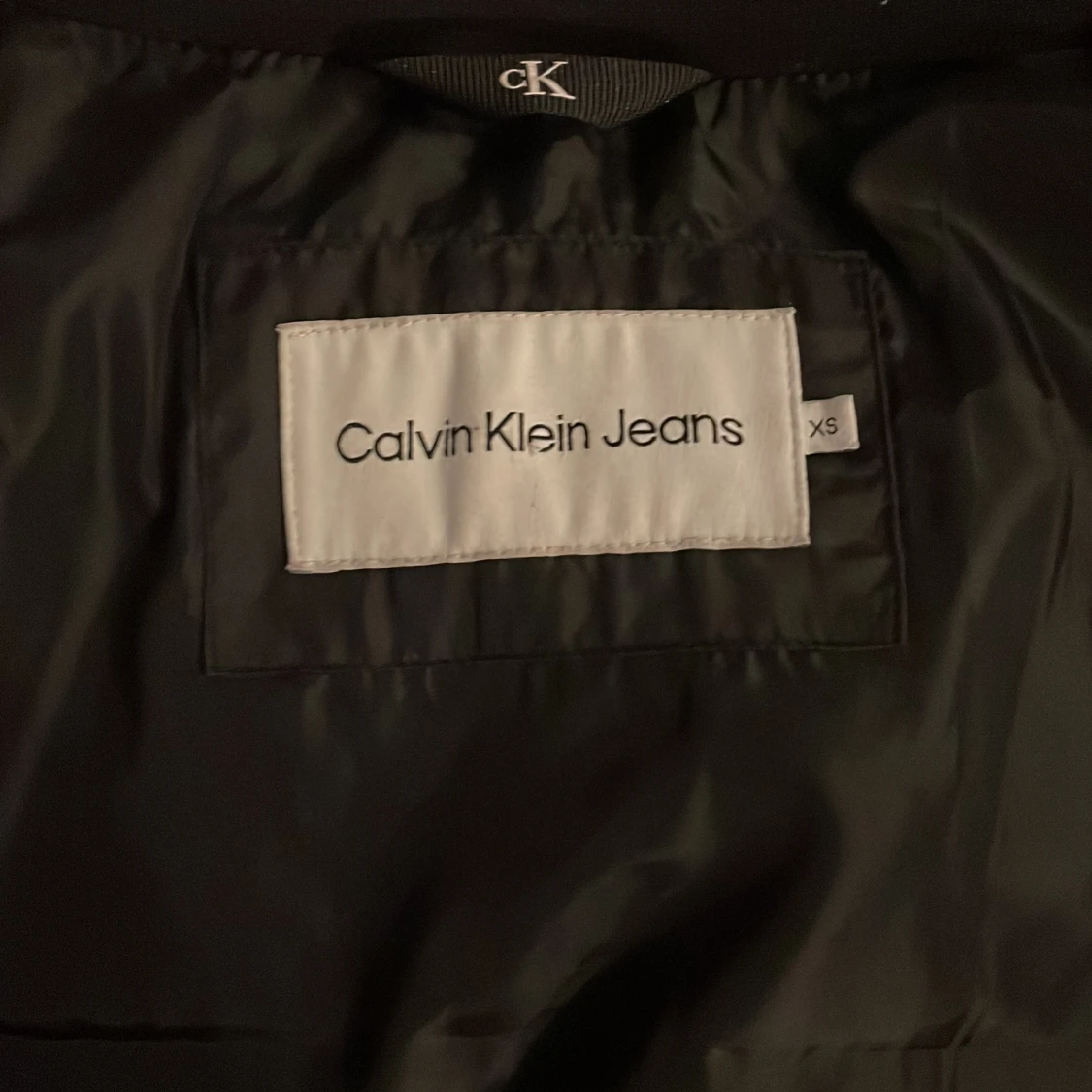 Säljer en svart pufferjacka från Calvin Klein Jeans med huva och dragkedja. Jackan har tydliga loggor på bröstet och ärmen samt ett stort Calvin Klein-tryck på insidan. Fodret är svart och vitt, och jackan är vadderad för extra värme. Perfekt för kalla dagar! Priset är inte fast!