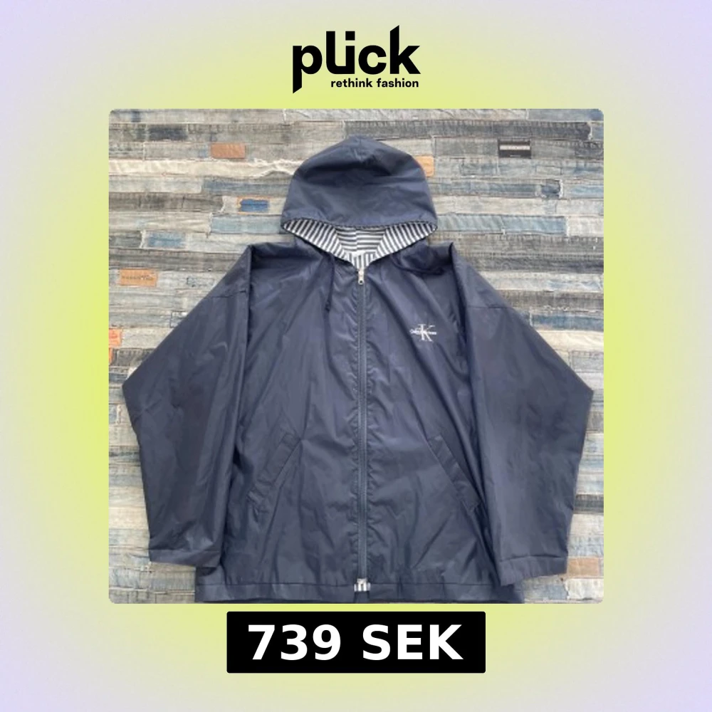 Säljer en marinblå/svart vindjacka från Calvin Klein med randigt foder och dragkedja. Jackan har en huva och två fickor framtill. Perfekt för blåsiga dagar. 💨