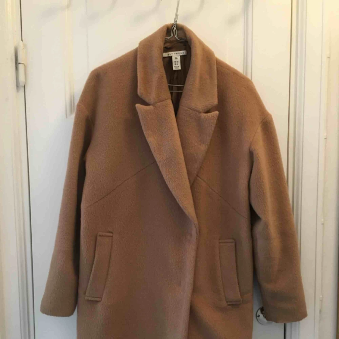 Kamel-färgad kappa från Nelly. Storlek 36 men lite oversize och passar även 38. Dubbelknäppning fram och två fickor, passar lika bra till fest som till vardags.