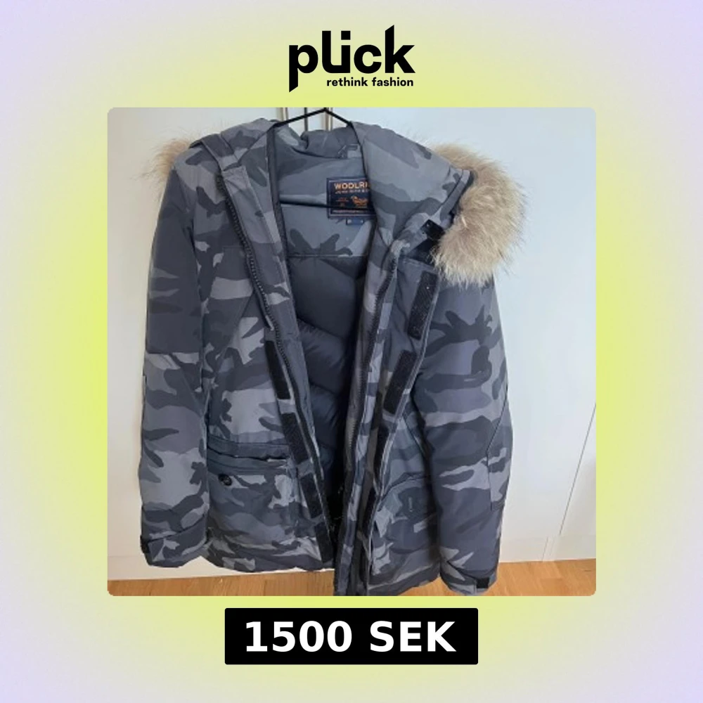 Säljer en grå camouflage dunjacka från Woolrich med päls. Jackan har dragkedja, knappar och flera fickor framtill.