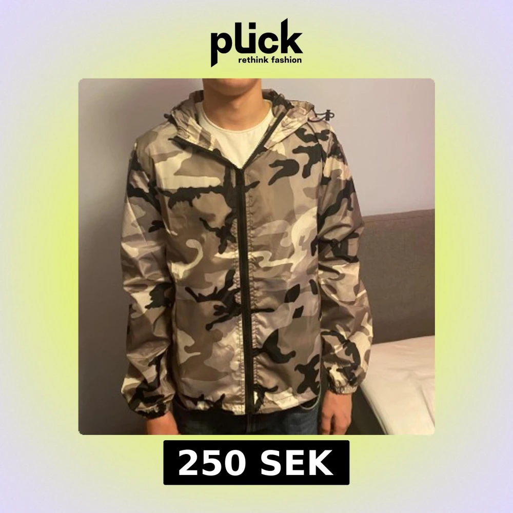 Säljer en snygg vindjacka från Lindfors med grå, beige och svart camouflage-mönster. Jackan har huva med snörning, hel dragkedja framtill och elastiska muddar vid ärmslut. Perfekt för dig som gillar streetstyle och vill sticka ut.