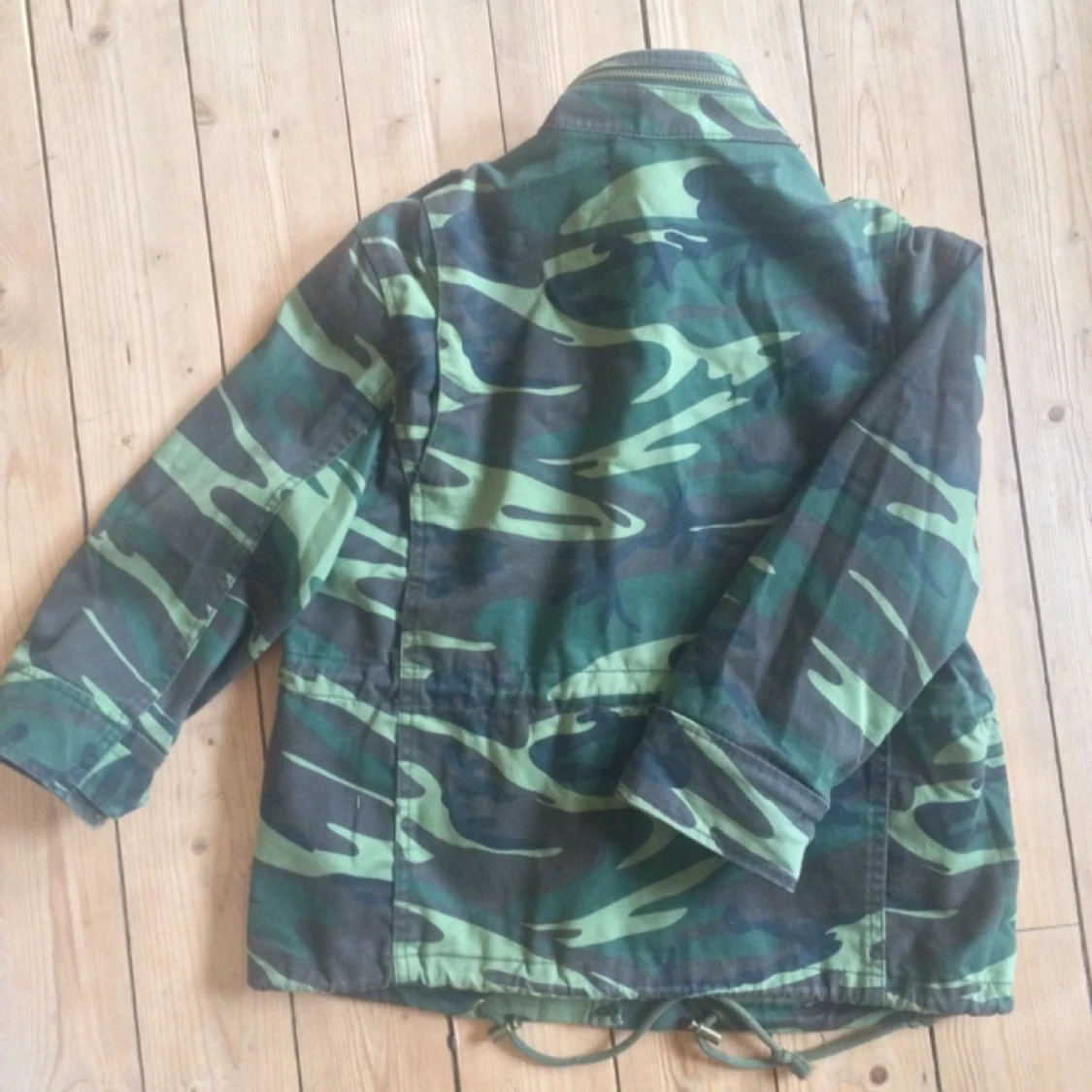 Camouflage-jacka i strl S, passar även M, vilket jag vanligtvis har. Kort modell med trekvartsärm, snygga detaljer. Stängs med dragkedja samt knappar. Färgen stämmer bäst överrens med bild 2. Inköp secondhand i New York. Bra skick.