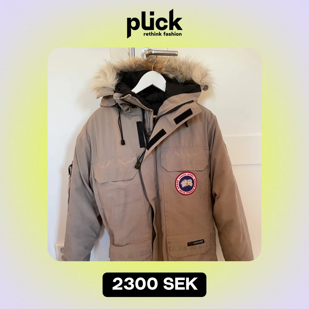 Säljer en beige vinterjacka från Canada Goose med pälsfodrad huva. Jackan har en dragkedja och kardborreknäppning framtill, samt flera praktiska fickor. Perfekt för kalla vinterdagar. Det finns lite slitage vid ärmsluten, men annars i mycket bra skick. Storlek 2XS, men stor i storlek och skulle säga att den passar XS-S.