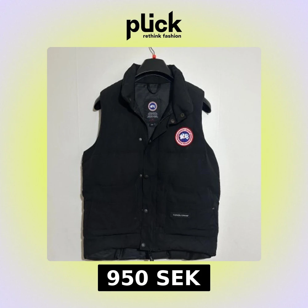 Svart dunväst från Canada Goose med klassisk logga på bröstet. Västen har hög krage, tryckknappar framtill och två stora fickor. Jag säljer den pågrund av att de är mitt ex och han har lämnat kvar den så jag säljer (pris kan diskuteras) snabb affär