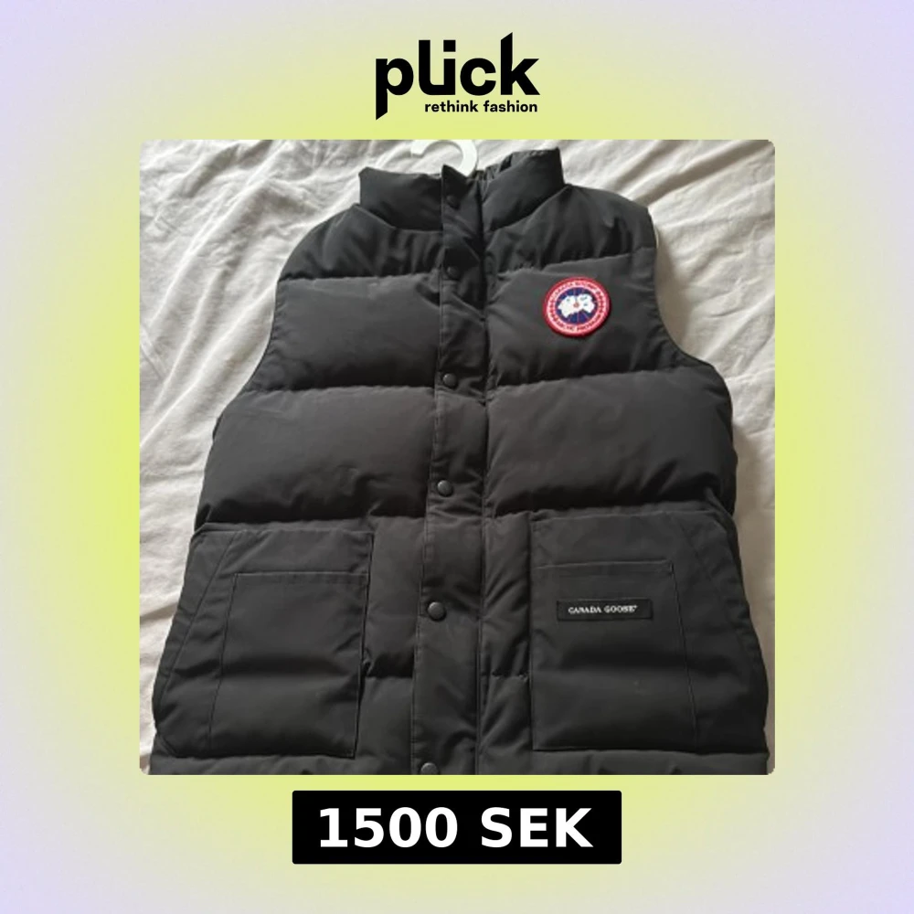 Hej Säljer en äkta svart dunväst från Canada Goose med klassisk logotyp på bröstet och två stora fickor framtill. Västen har hög krage och stängs med knappar. Perfekt för lager-på-lager under kyliga dagar. Den e i storlek xs men passar s skriv vid fler funderingar (äkta väst) pris ej hugget i sten